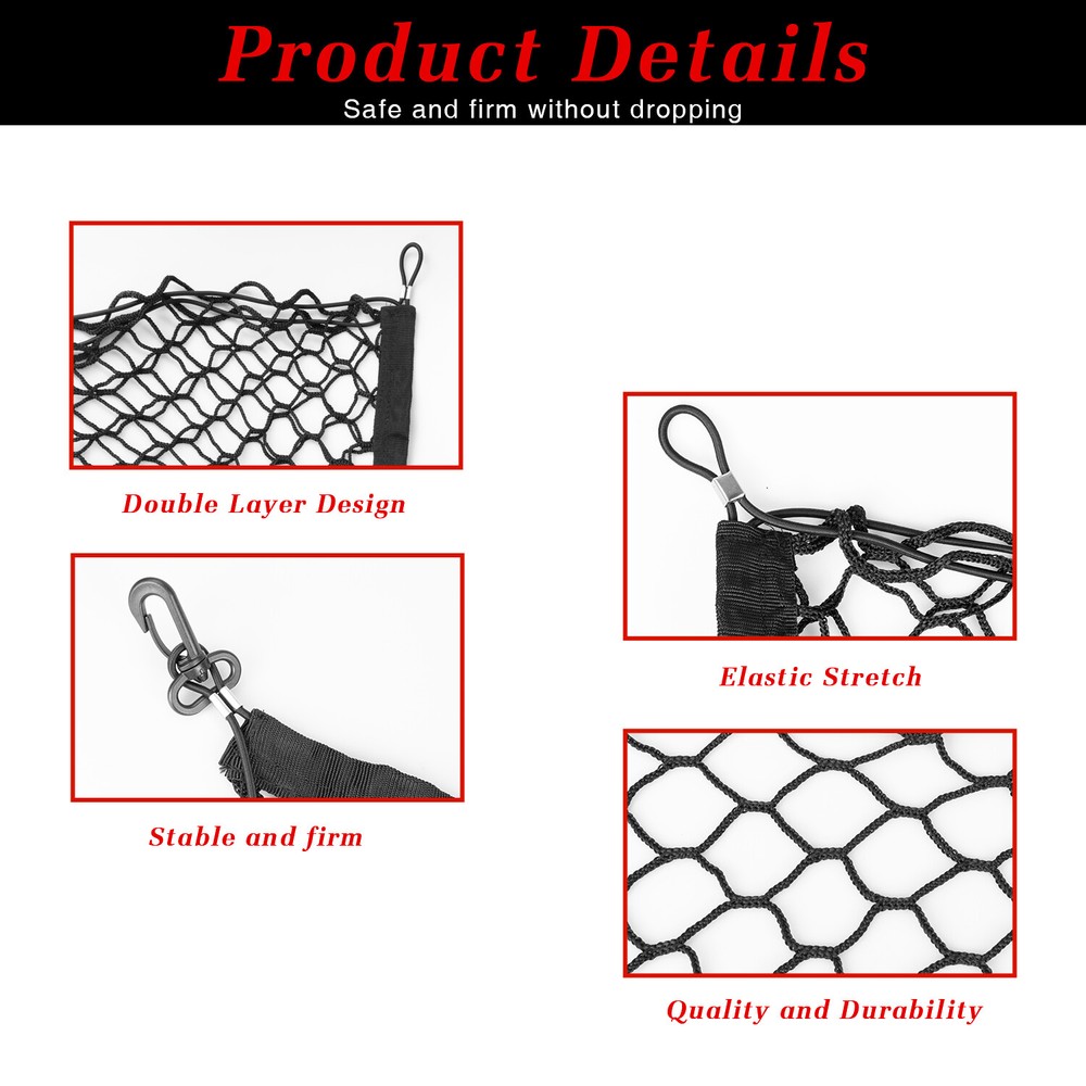 Description: 1. Unique shape, simple style, easy to install.drive organized & be clutter-free! 2. Smooth elastic net, strong scalability, it won’t be dropping for lack of resilience.that holds items upright and in place. 3. Use the Hook contact the Fixed point(Your Rear Trunk Need Have The Fixed Point) 4. Natural size : 125cm (49.21" inch) x 40cm (15.74"inch ) Notice: 1. Before Purchase Check Your Rear Trunk Have Attachment Points.(as picture show) 2. There may be 1-3cm tolerance due to manual measurement. D rive organized & be clutter-free! The days of groceries rolling around on the drive home are over. Custom-crafted for the cargo area, this durable elastic-mesh net has a floor-style design That holds items upright and in place. It attaches in seconds to mounting points in the cargo area and folds flat when not in use. Great storage solution to help you driving be organize and clutter-free! It’s Stretchable to Fit the Span the Width of The Pickup Bed or Wherever It Is Needed. The Truck Net Stretches Around Your Stuff and You Can Cram Even More Things in It Than Ever Before Package Includes: 1 x Fixed Cargo Double Elastic Net Bag 4 x Screw 4 x Hook 4 x Adapter Hook