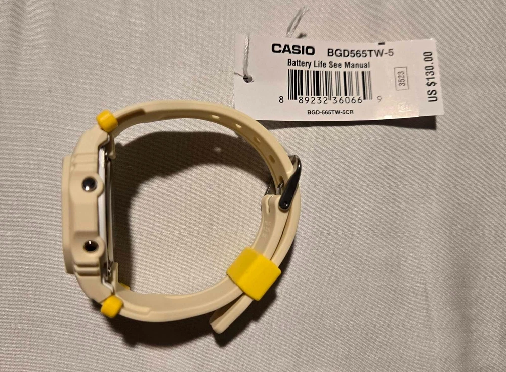 Movement:QuartzFeatures:1/100-second stopwatch, Multi-function alarm, Hourly time signal, LED backlight (Super Illuminator), Full auto-calendar (to year 2099), 12/24-hour format, Countdown timer, Flash alertModel:Casio Baby-GType:WristwatchDepartment:Womengtin13:889232360669Reference Number:BGD565TW5Brand:CasioUPC:889232360669Display:DigitalBand Material:Resin