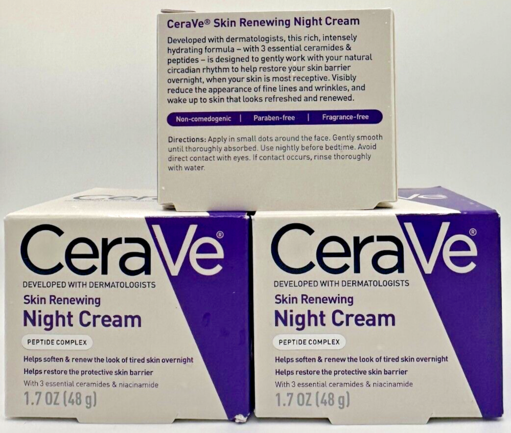 3X! NEW! IN BOX! CeraVe Skin Renewing Night Cream Peptide Complex 1.7oz./48g 🌟 Brand New Products! 🌟 Enjoy fast and free shipping within the US on all our items! If you have any questions or need assistance before making your purchase, please don’t hesitate to reach out. We’re here to help! 💬 Open to Offers! Looking to buy in quantity? We welcome offers on larger orders—just let us know your desired quantity and price! Thank you for considering our products! Happy shopping! Feel free to customize it further if you’d like!