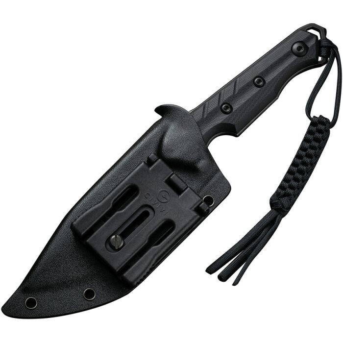 10.25" (26.04cm) overall. 4.75" (12.07cm) black stonewash finish D2 tool steel spear point blade. Black G10 handle. Full, extended tang. Lanyard hole. Bob Terzuola T-Clip. Braided paracord lanyard. Black Kydex belt sheath. Boxed