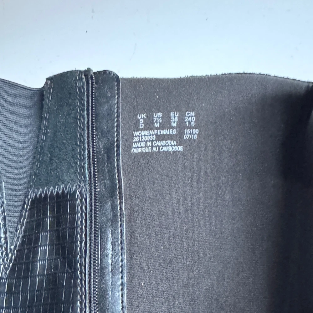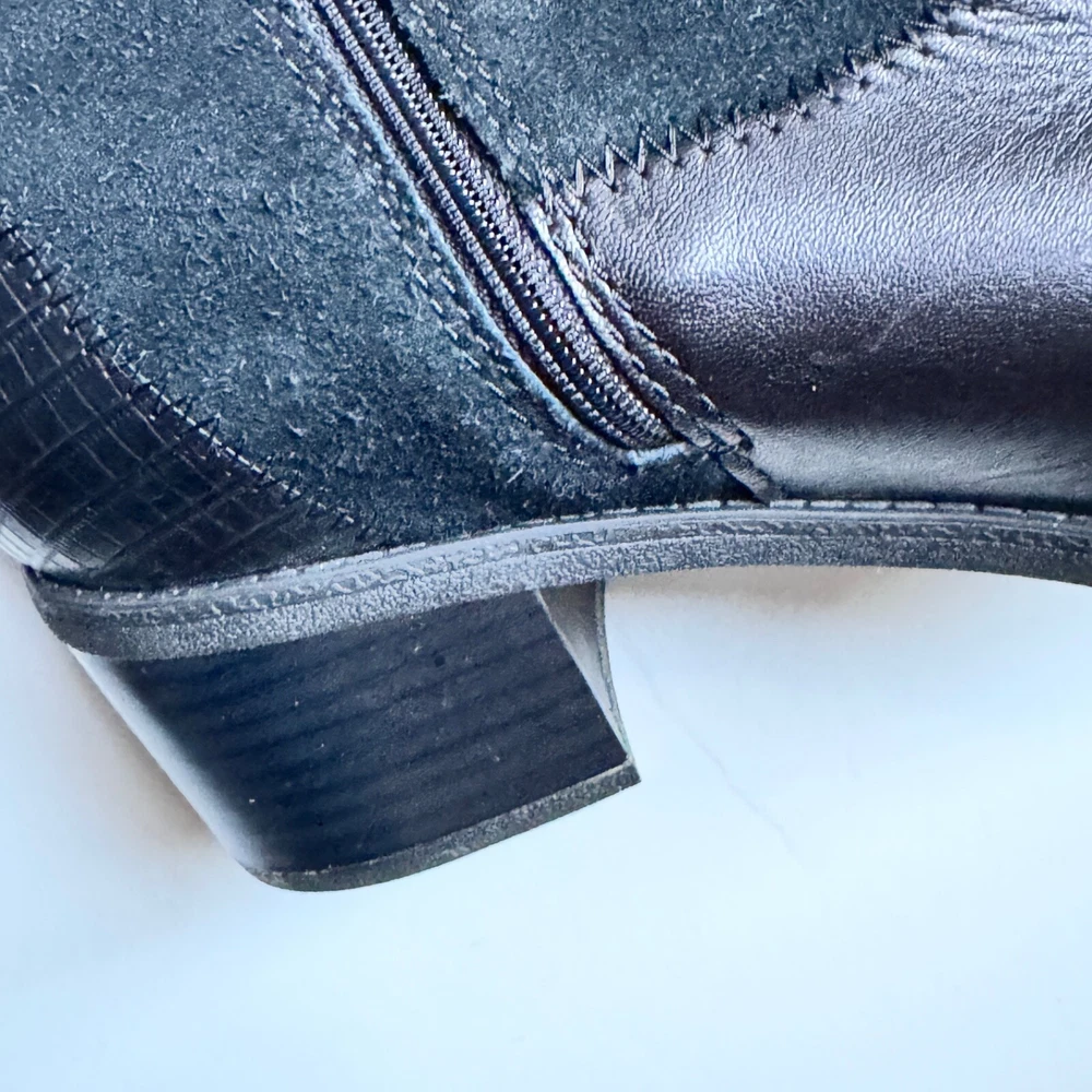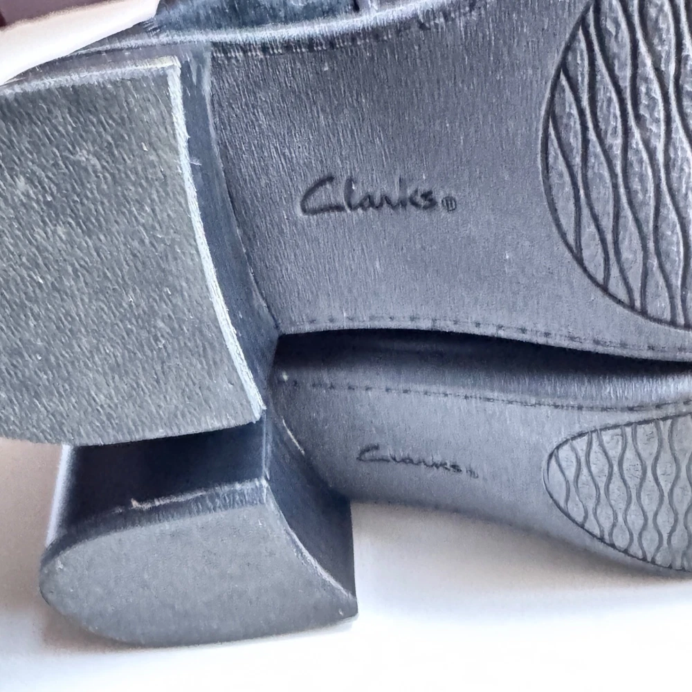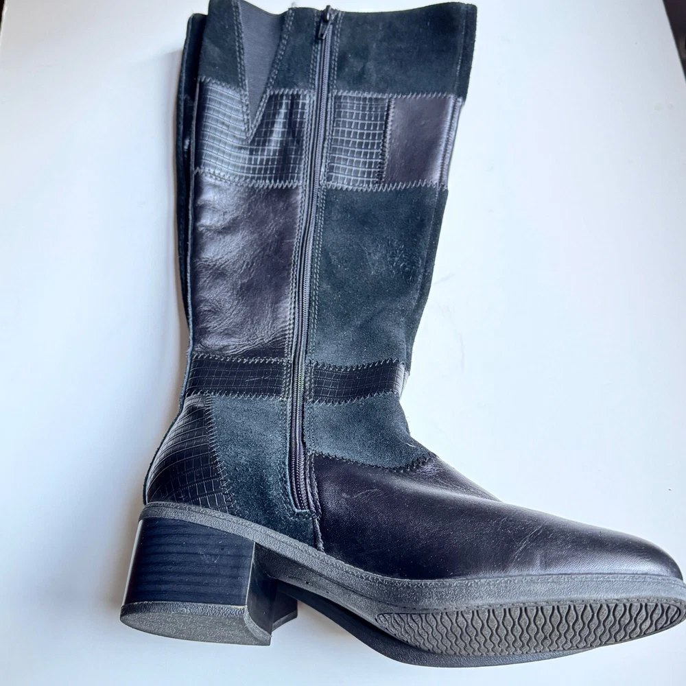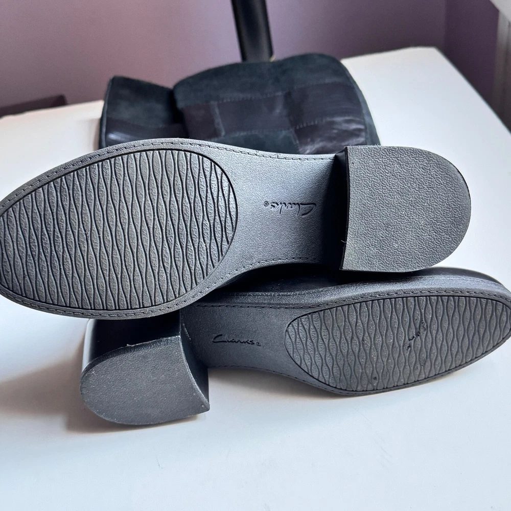 Elevate your style with these chic Clarks knee-high boots in black suede/leather. Featuring a round toe and adjustable zip closure as well as soft cushion, these boots are both comfortable and fashionable. Perfect for any occasion, whether it be travel, business, or casual wear, these boots will surely become a staple in your wardrobe. The Clarks collection is known for its quality and these boots are no exception. With a mid-height block heel and medium calf width, they are designed to provide both comfort and support. The solid pattern and black color make them versatile and easy to pair with any outfit. Don't miss out on the chance to add these stylish boots to your collection. If you have any questions ask before buying. From no smoking, no pets home. Shipping price for 48 continental US states only. For international shipping ask quotes.
