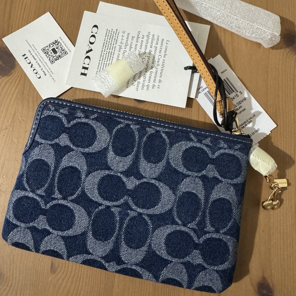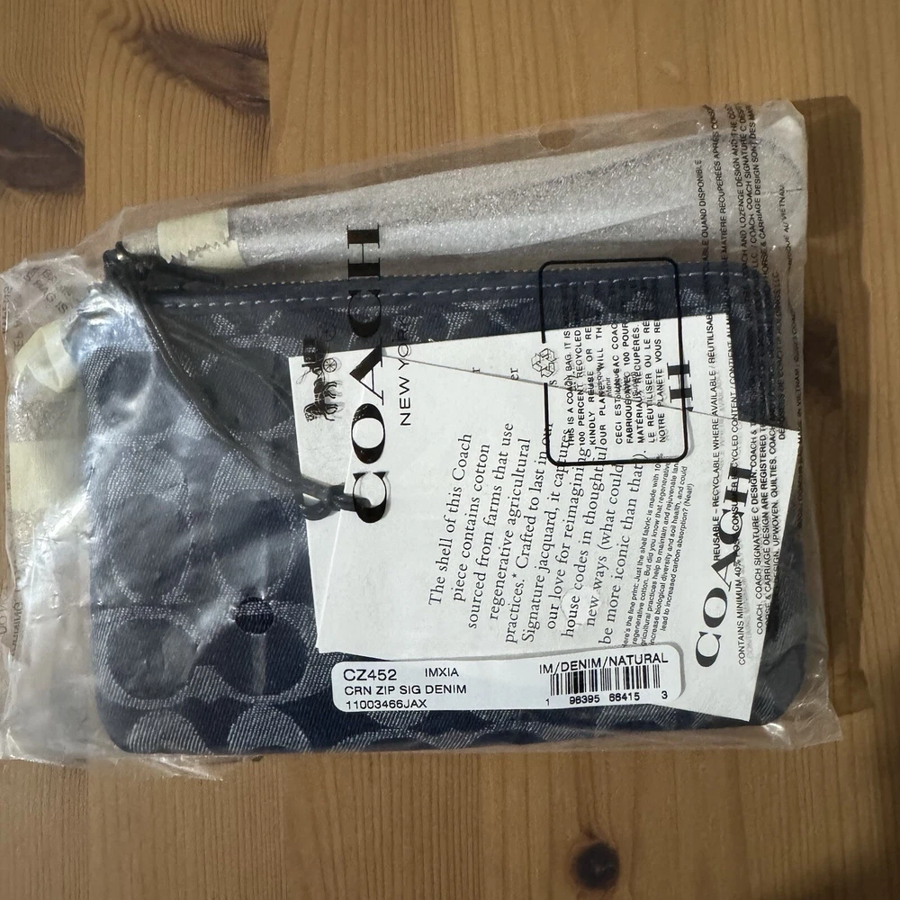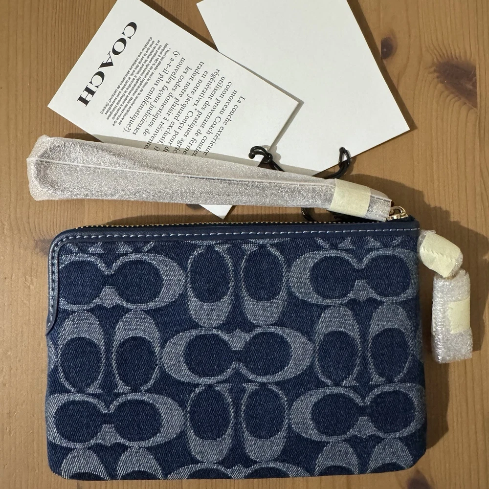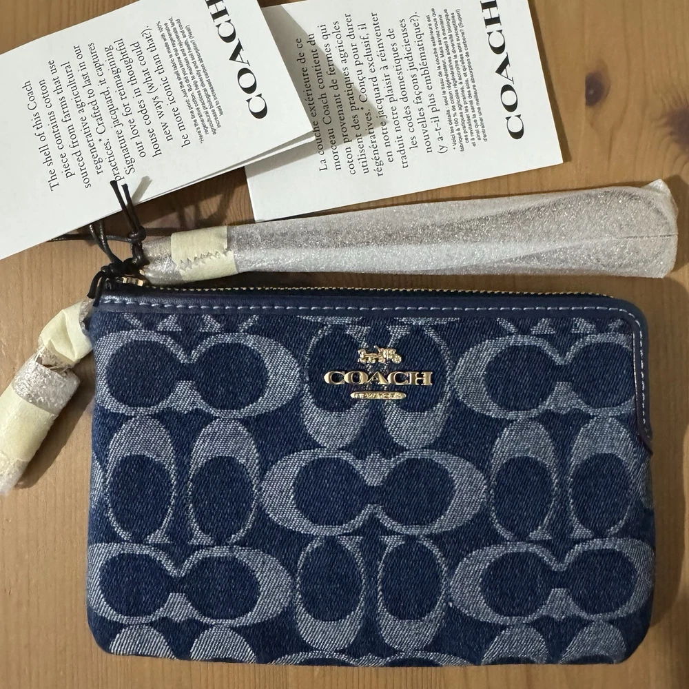 This wristlet is a perfect blend of style and sustainability! The Coach denim with gold accents looks chic, and the compact size fits essentials easily. Love the two card slots and zip-top closure—keeps everything secure. The attached wrist strap makes it super convenient, and knowing it’s made with eco-friendly cotton is a huge plus. A must-have for effortless, conscious fashion!