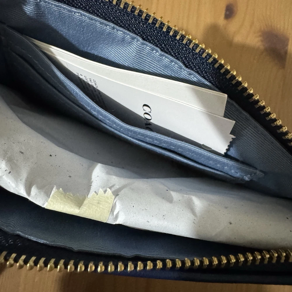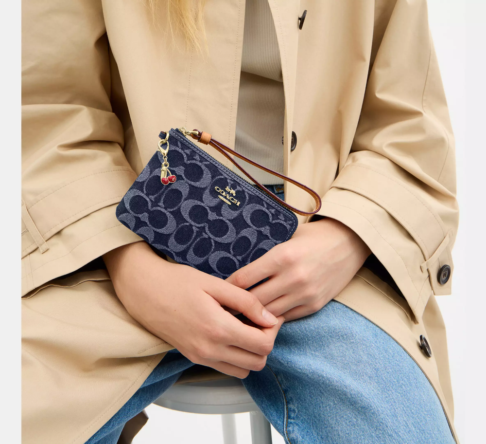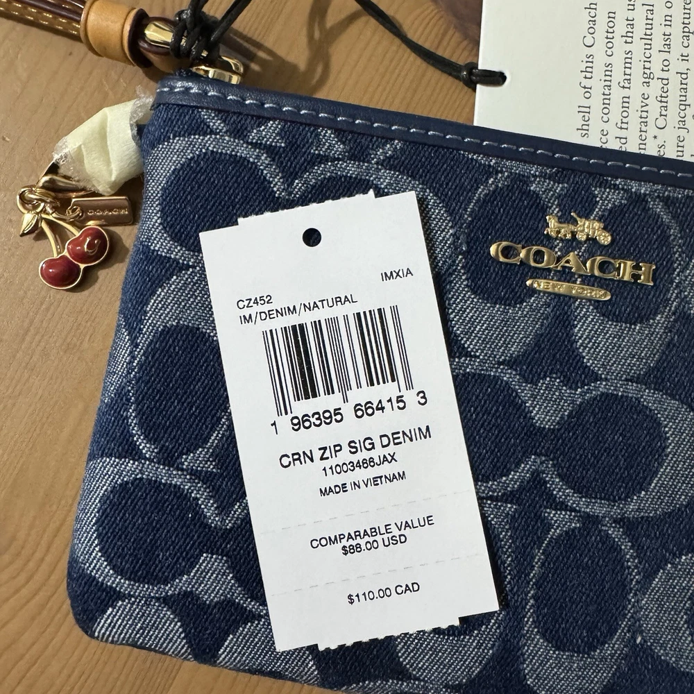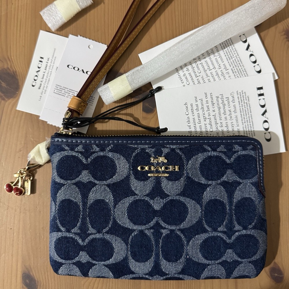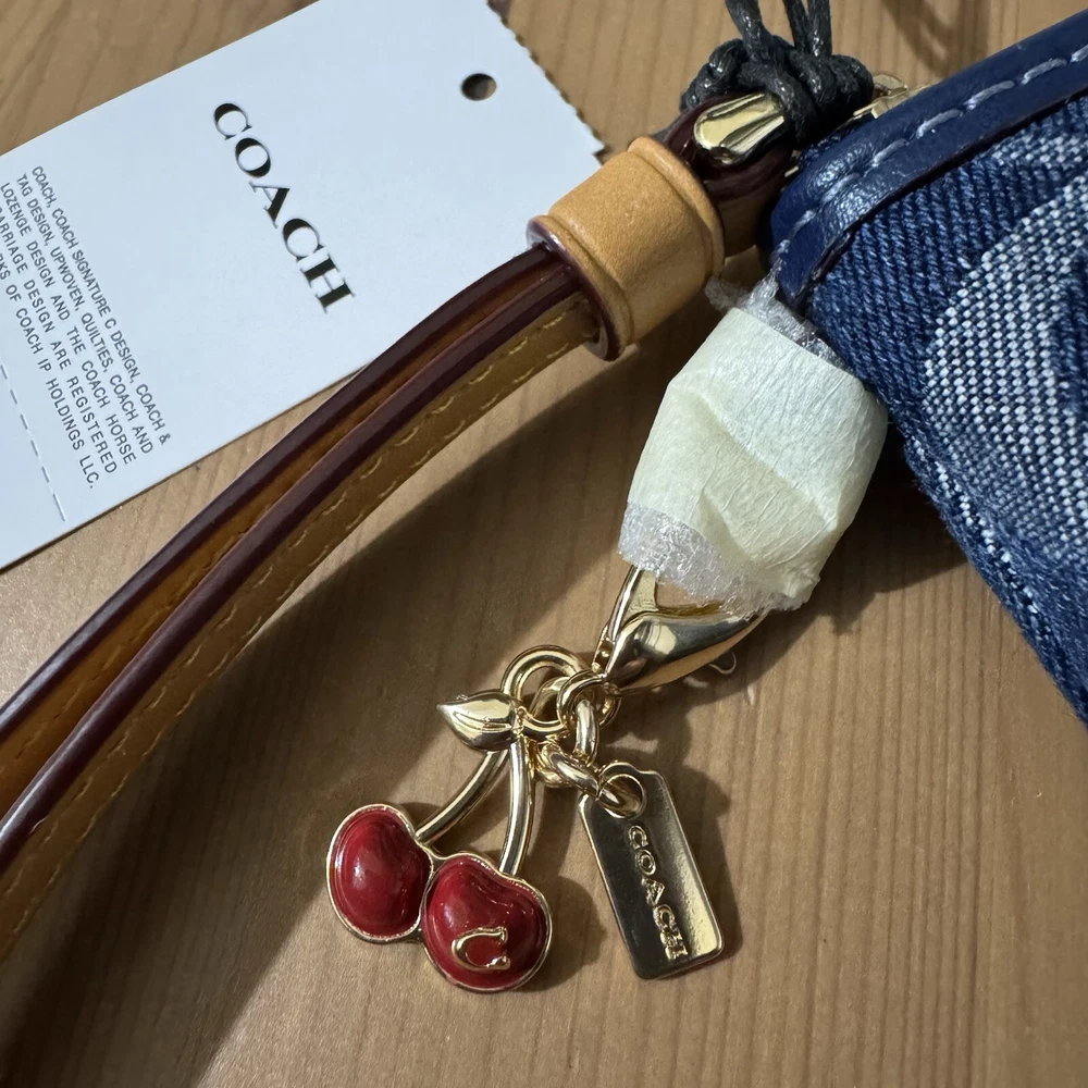 This wristlet is a perfect blend of style and sustainability! The Coach denim with gold accents looks chic, and the compact size fits essentials easily. Love the two card slots and zip-top closure—keeps everything secure. The attached wrist strap makes it super convenient, and knowing it’s made with eco-friendly cotton is a huge plus. A must-have for effortless, conscious fashion!