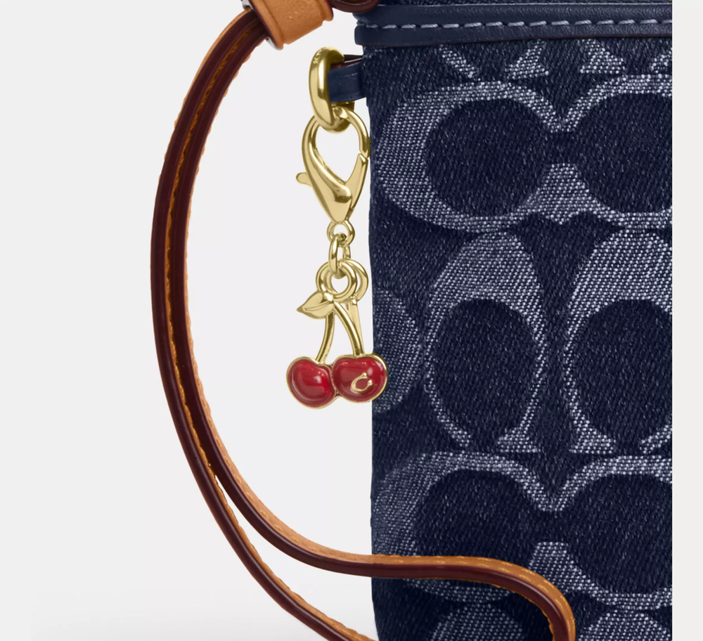 denim/Gold/Den Gold/Natural Style Number CZ452 Measurements Length: 6.25" Height: 4.0" Width: 0.5" Materials Signature denim and vachetta leather Fabric lining Features Two credit card slots Zip-top closure Wrist strap attached Additional Details Exclusive of trim, this denim style is crafted of cotton sourced from farms that use regenerative agricultural practices—those that help to maintain and rejuvenate land, increase biological diversity and soil health and could lead to increased carbon absorption