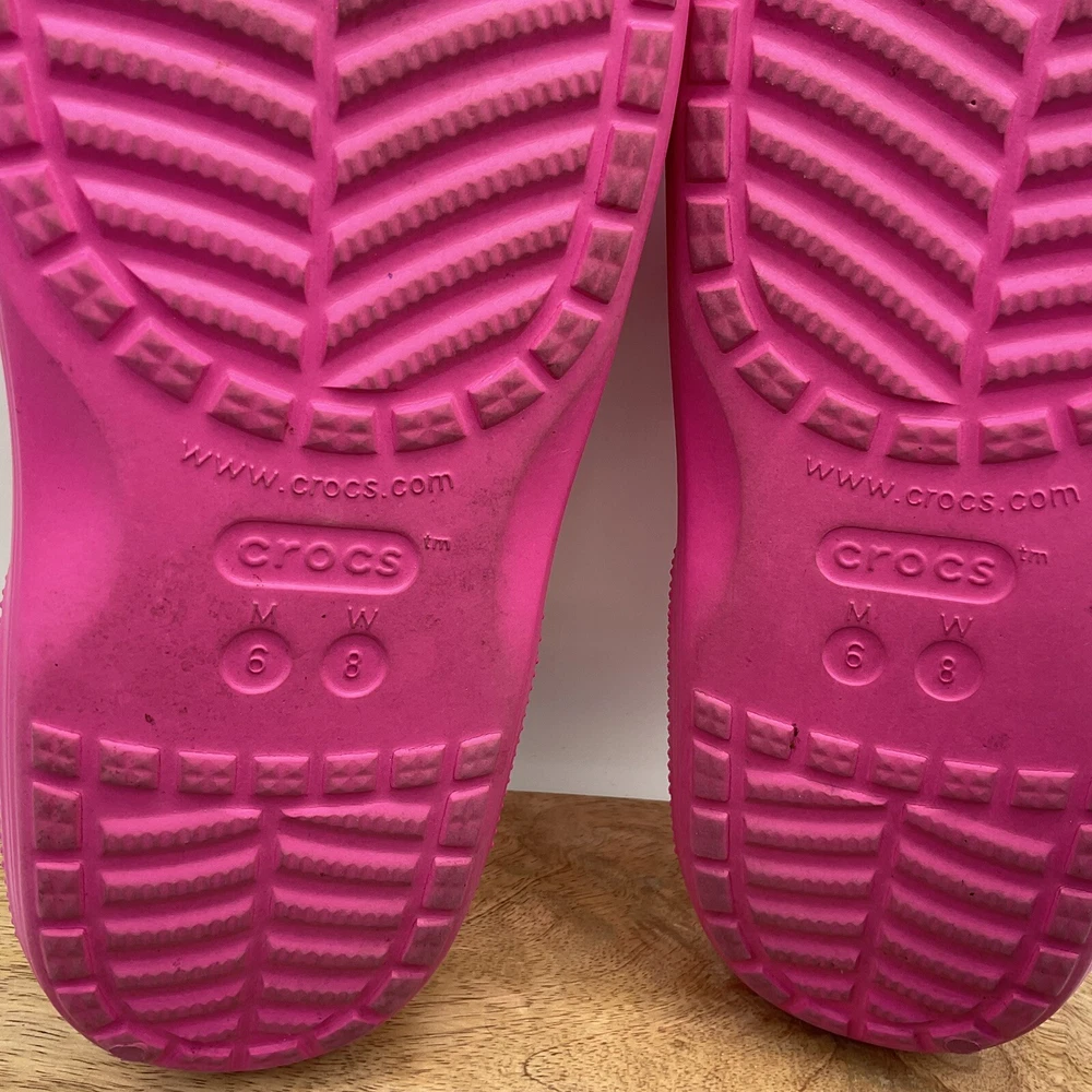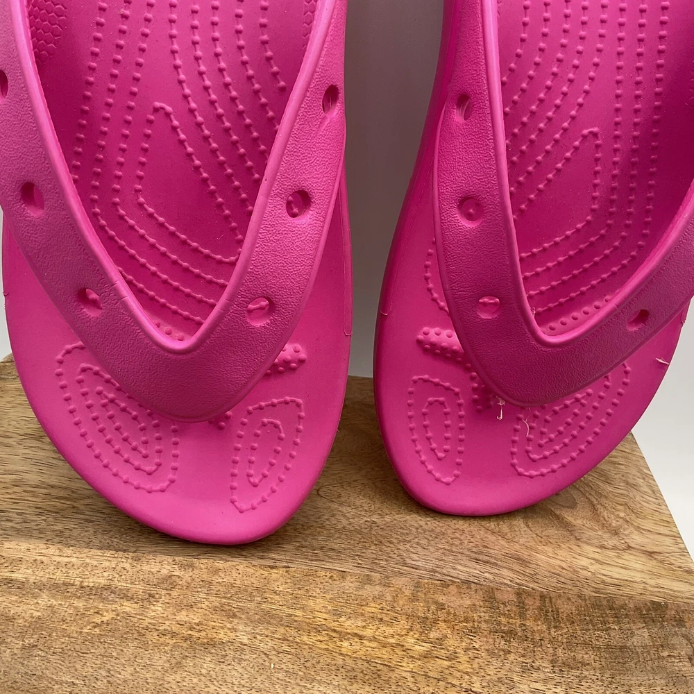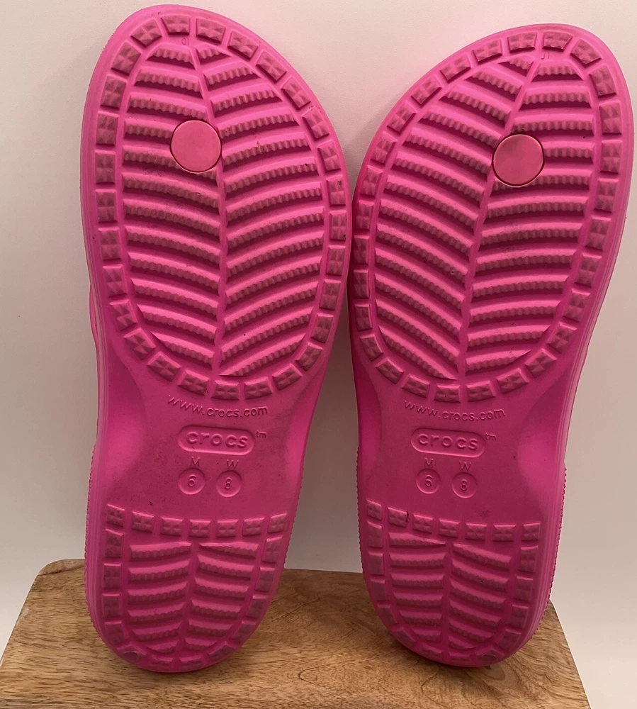 The Crocs Women's Classic Platform Flip Flop Sandals in Pink, US size 8, feature a slip-on closure and a low block heel. These sandals are designed for casual wear, activewear, and travel occasions, with a waterproof synthetic upper and outsole material. The Classic Crocs model has a comfortable fit with a M width, suitable for all seasons. Perfect for women looking for a versatile and practical sandal option with a touch of classic style. EUC. No imprints on inner sole. Hot pink! See pictures as part of description. Save our store so you’ll be the first to see new items!