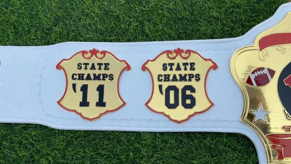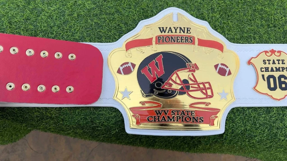 New Customise Wayne WV Pioneers State Championship Title Belt *ALL PICS ARE OUR OWN MANUFACTURED BELT'S PICTURES* FEATURES METAL PLATES. GOLD PLATING. GENUINE HAND CRAFTED LEATHER BELT. THE PLATE IS WITH DEEP ETCHING LOOKS VERY REALISTIC STRAP IS MADE FROM 100% (COWHIDE) LEATHER SNAP CLOSURE. ADULT SIZE. BELT FULL LENGTH IS ALMOST 50". FITS UPTO 46" WAIST. We take almost 5 (maximum) days ship the item. Payment Details Payment is required after placing the order; complete as per eBay order total; via PayPal (Credit Card holders can make payment via Paypal) We Manufacture all Type of Replica Championship Belts (WBO, WWE, WBA, IBI, IBF, MMA, IFS) Contact us for Details.