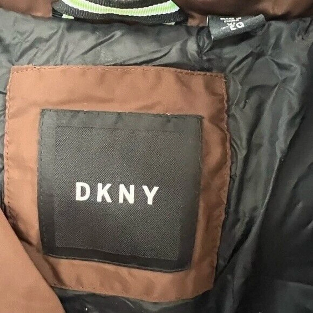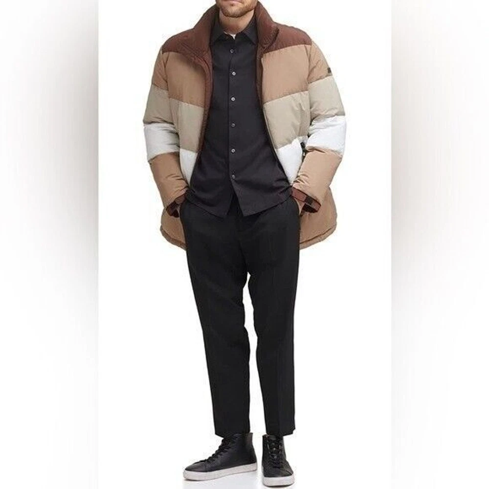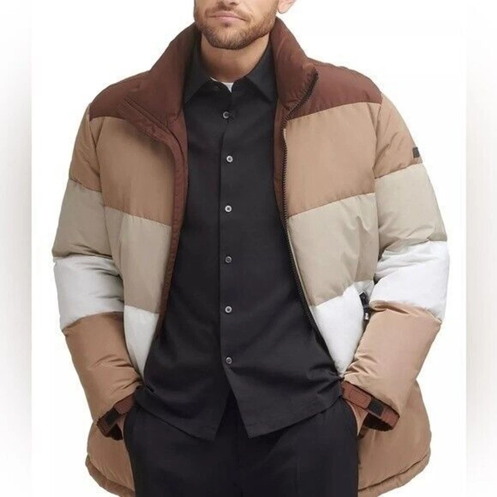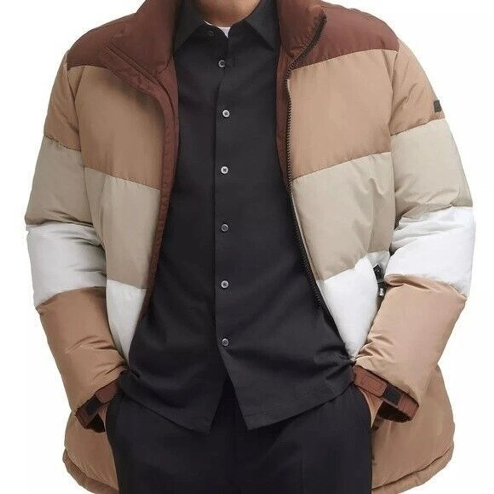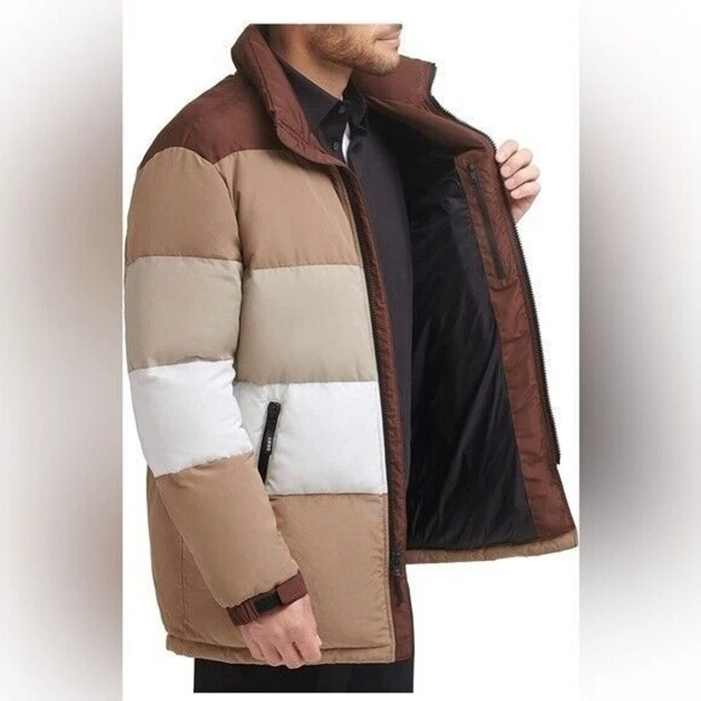 Step into both style and comfort for cold evening on the town with the bold, runway-ready quilted body and heavyweight design of this fresh take on the classic walking coat from DKNY. Heavyweight Regular fit Zip-through collar; full-zip front closure Two welt zipper pockets DKNY logo plaque on left sleeve; colorblock style (brown colorway); mixed media (red colorway) adjustable cuffs Shell: faux memory/patent faux leather polyurethane (red colorway); polyester faux memory (brown colorway); body lining: nylon; sleeve lining: polyester; DXIMP666 Age Group adult Gender male Color brown combo