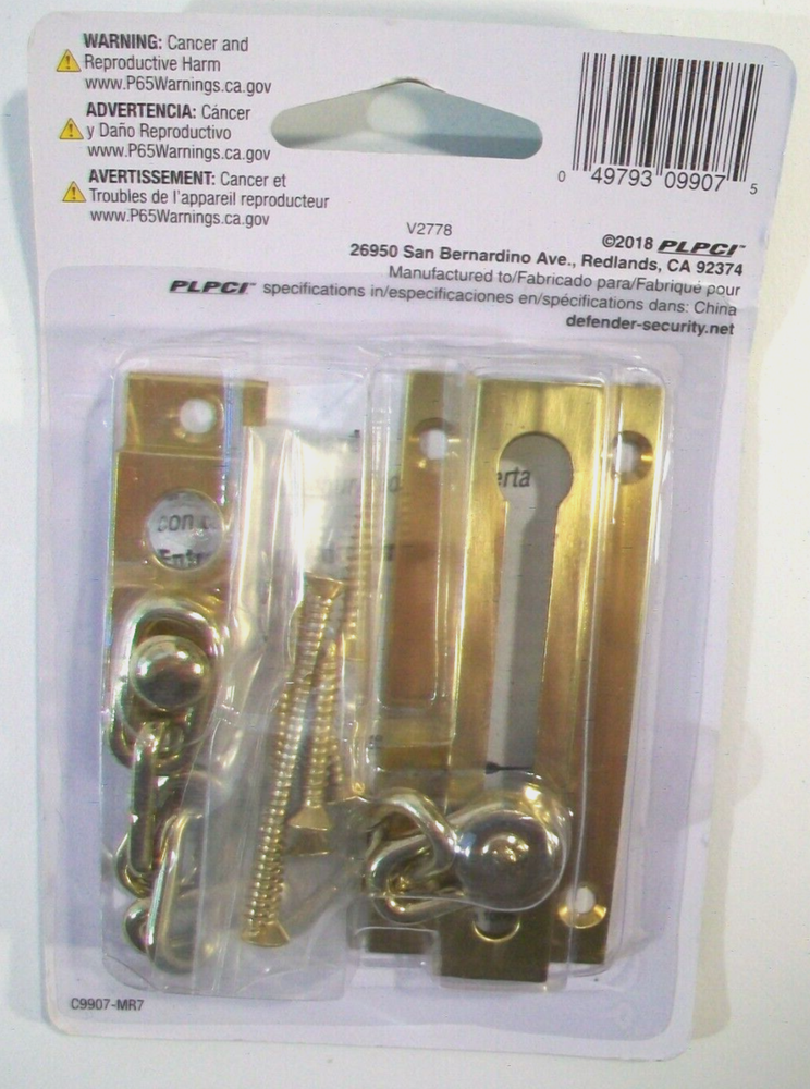 DEFENDER SECURITY BRASS SLIDE CHAIN ENTRY DOOR GUARD LOCK. NEW, PACKAGING HAS A LITTLE SHELF WEAR (SEE PHOTOS) #U 9907.
