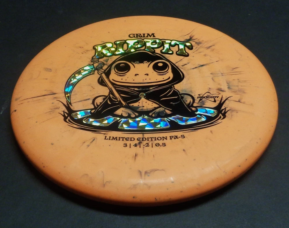 Prodigy Halloween-Grim Rippit-Soft Fractal 300-176-Limited Edition. The PA-5 is a silky smooth understable putter that will hit beautiful slow turnover lines and dead straight hyzerflips. It has a narrow feel in the hand for an easy release. 300 Soft Fractal plastic-has splatters of colors. Plastic is grippy & Flexible. Shipped bagged/cardboard backing in a bubble mailer with Tracking.