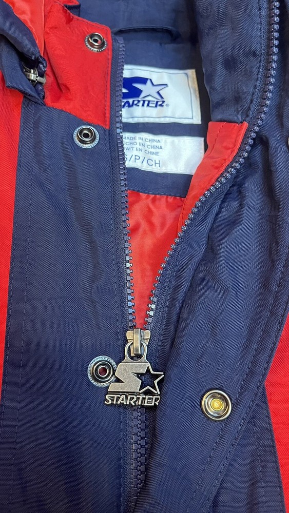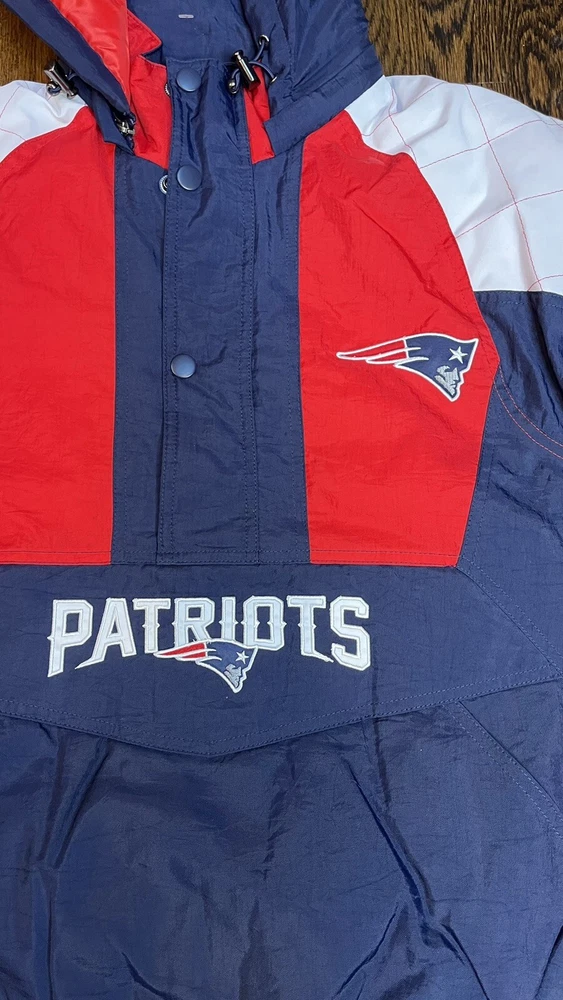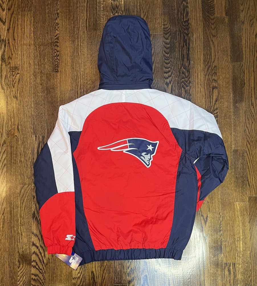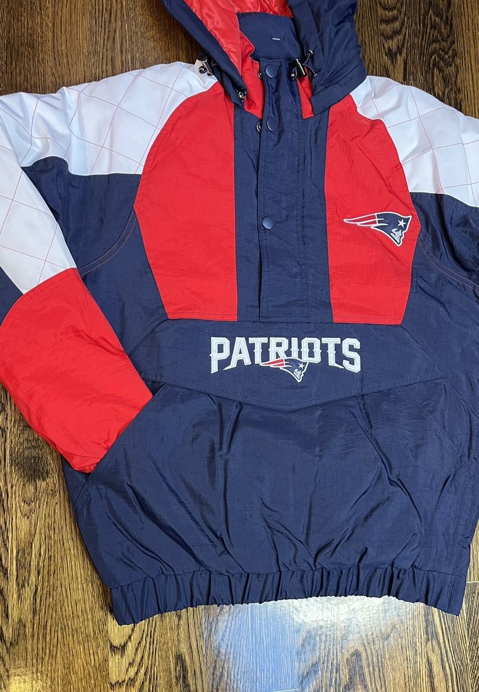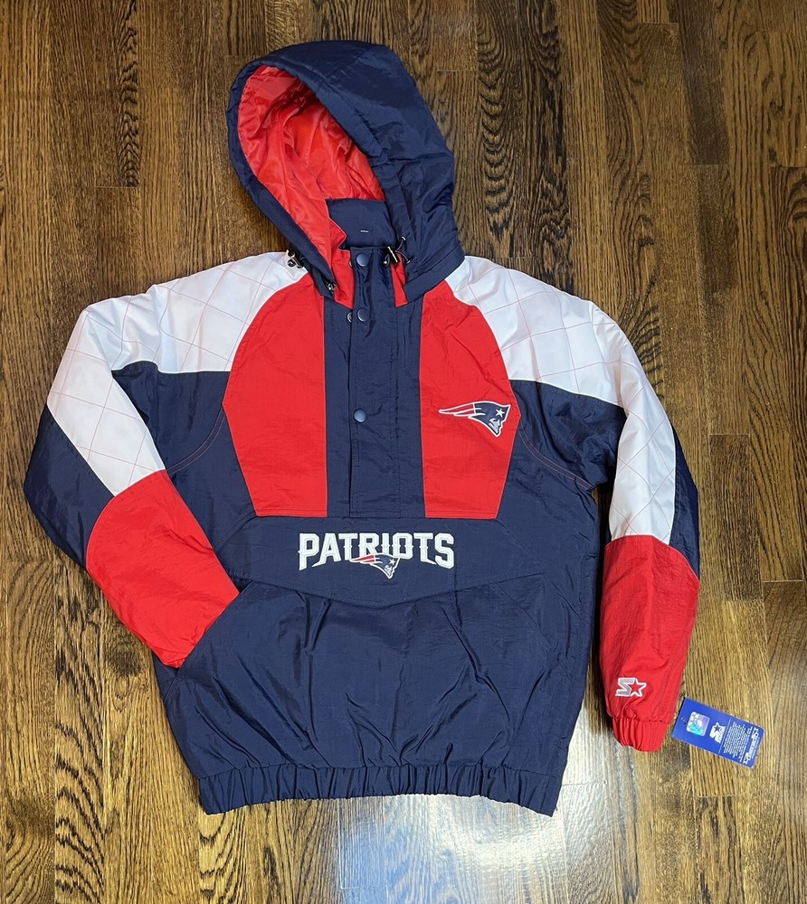 Starter X New England Patriots NFL Half-Zip Pullover Hoodie Jacket Mens Size SMALL Material: Polyester Fabric Color: Navy blue and red Inner lining: Viscose lining Collar: Hooded collar Closure: Half zippered closure Sleeves: Full length Cuffs: Elastic cuffs Pockets: Two waist pockets Worn by both the genders Kangaroo pockets