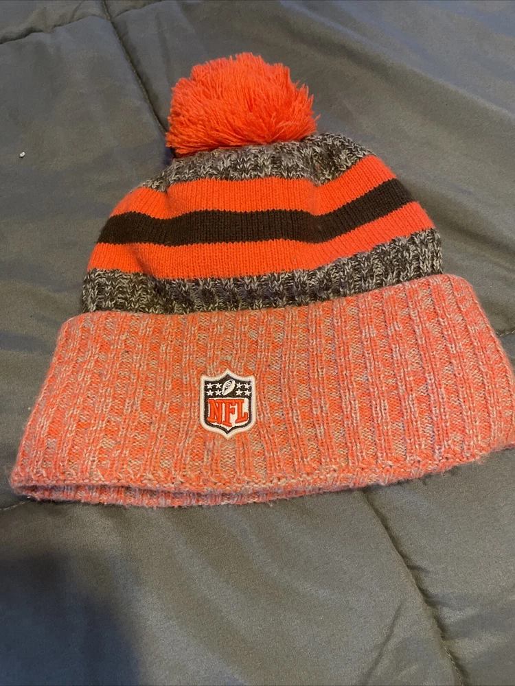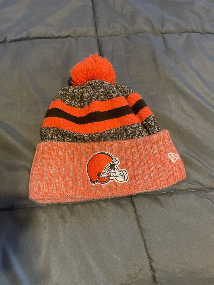 A hat that i bought last year to go to a cleveland browns game and wore it only 4 times. Fits great and is super warm. Great for those mornings shoveling snow from the driveway Show off your support for the Cleveland Browns with this stylish and warm beanie from New Era. Featuring the team's iconic logo in brown and white stripes, this unisex adult hat is perfect for any die-hard fan. Made from high-quality materials, this cap is designed to keep you comfortable during the cold winter months. Whether you're headed to the game or just running errands, this hat is a great addition to any Browns fan's collection. So why wait? Grab your New Era Cleveland Browns beanie today and show everyone your team spirit!