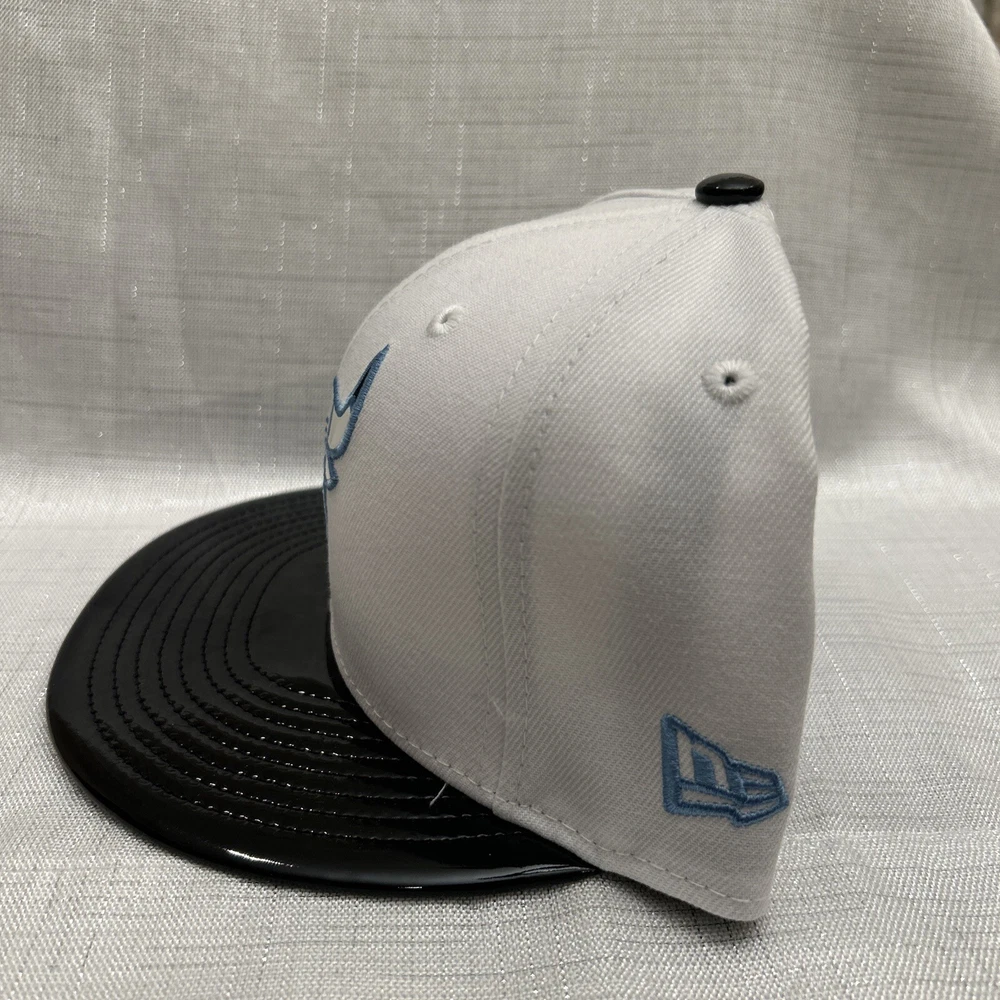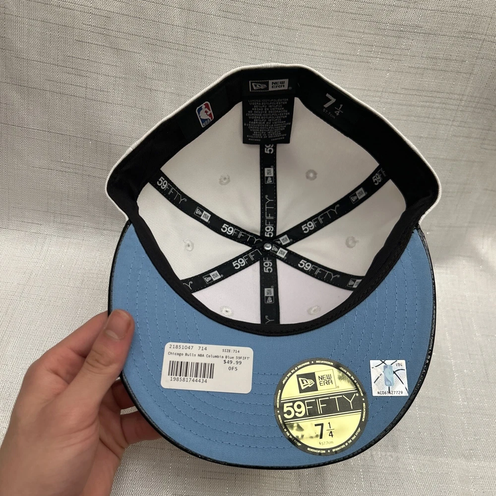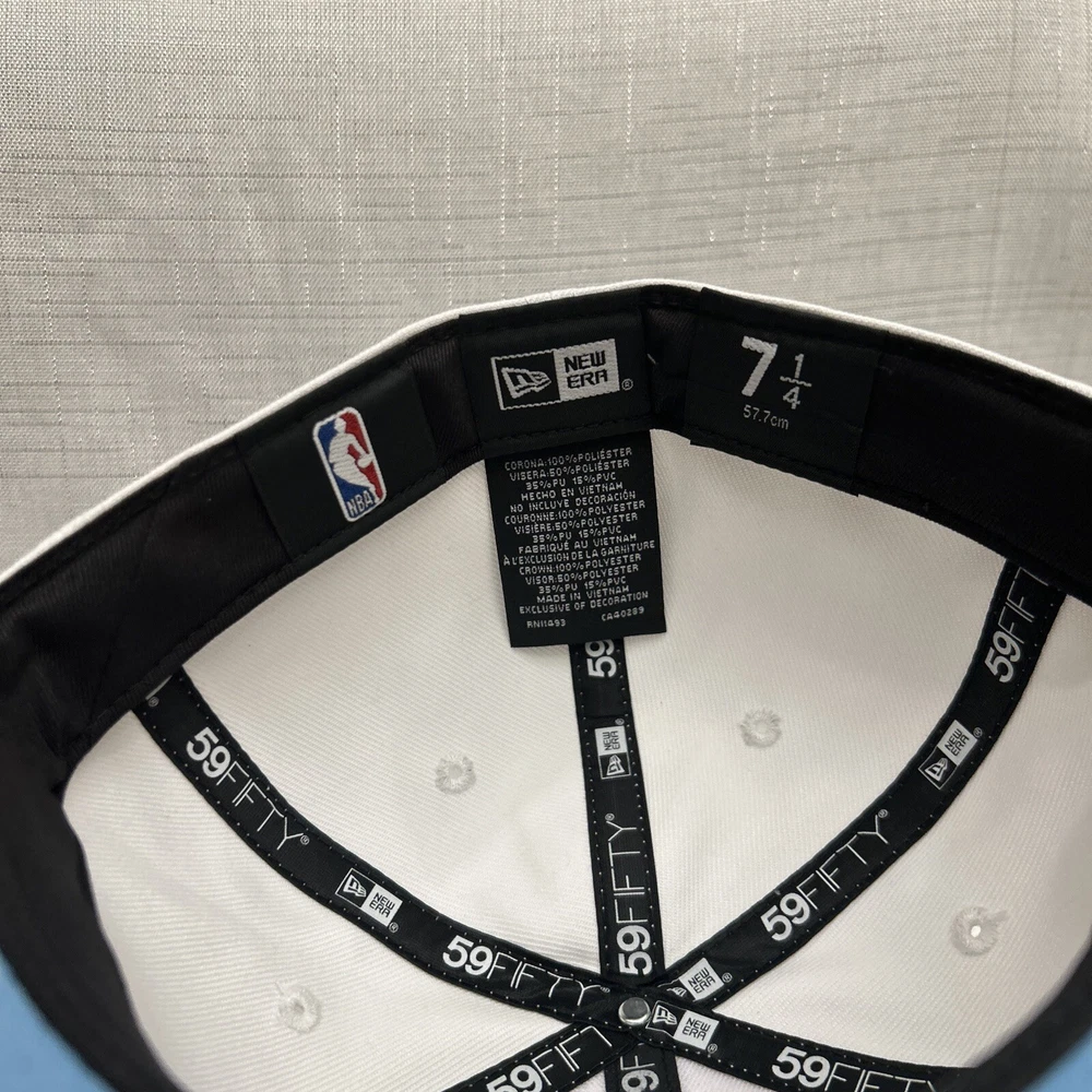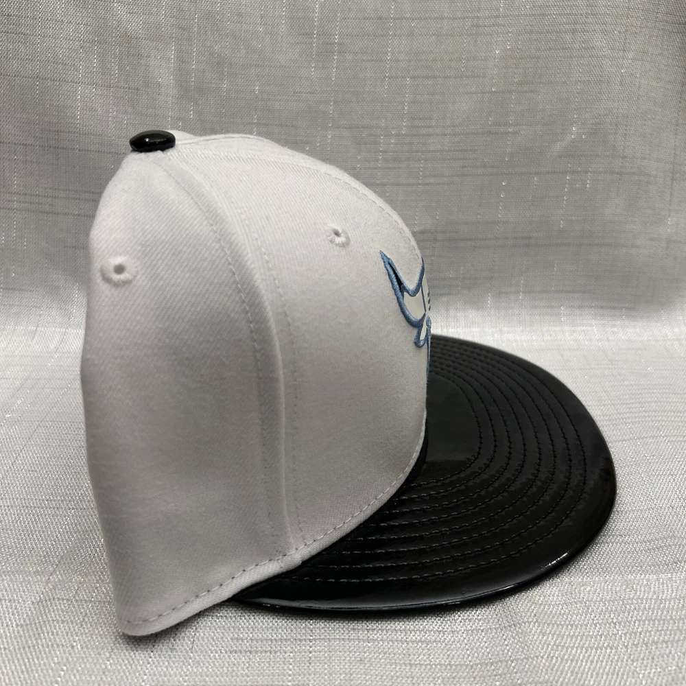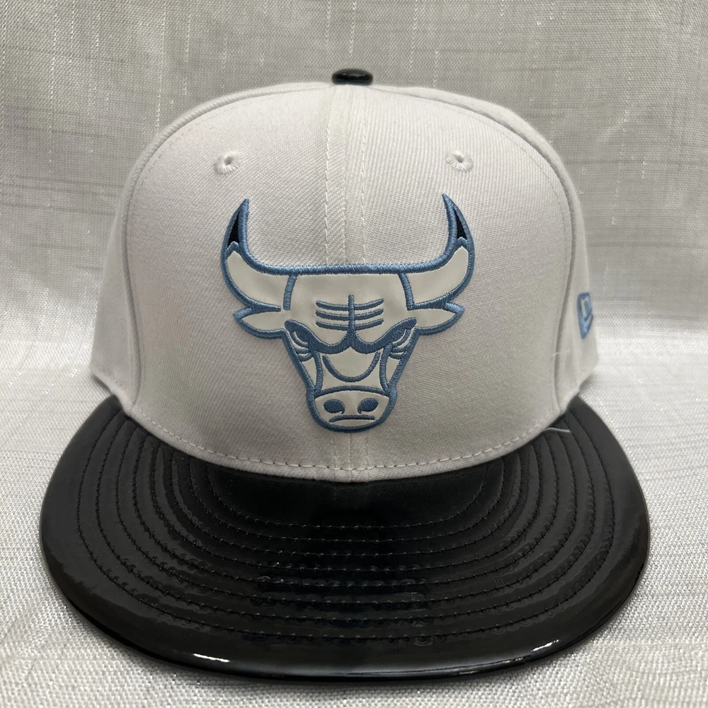 The product is a New Era 59FIFTY Fitted Cap for the Chicago Bulls in size 7 1/4. It features a patent leather design in black with blue accents. This cap is designed for men and is an officially licensed product for the National Basketball Association (NBA). Perfect for basketball fans looking to show support for the Chicago Bulls in style.
