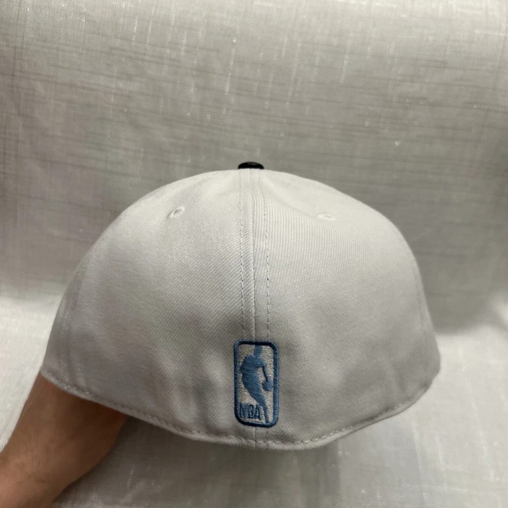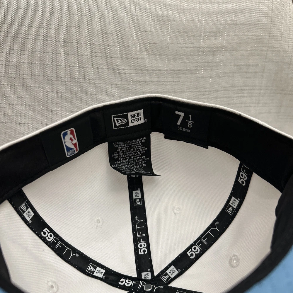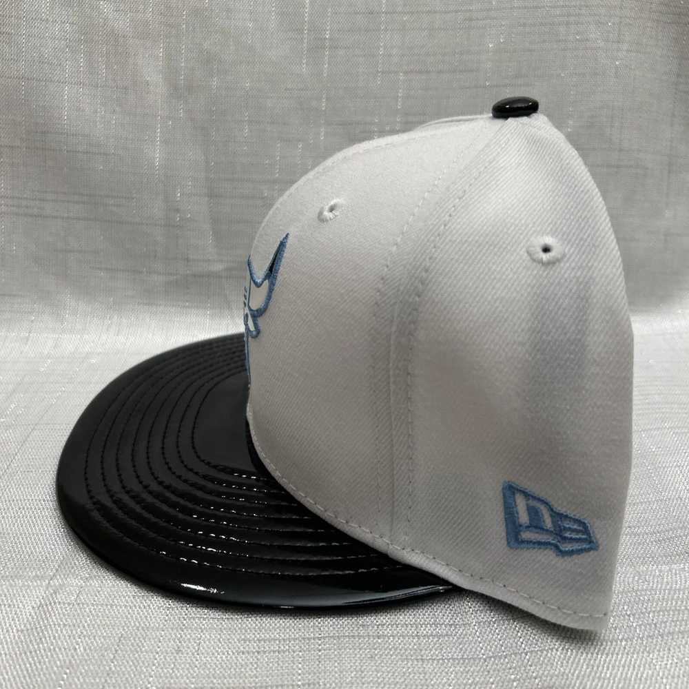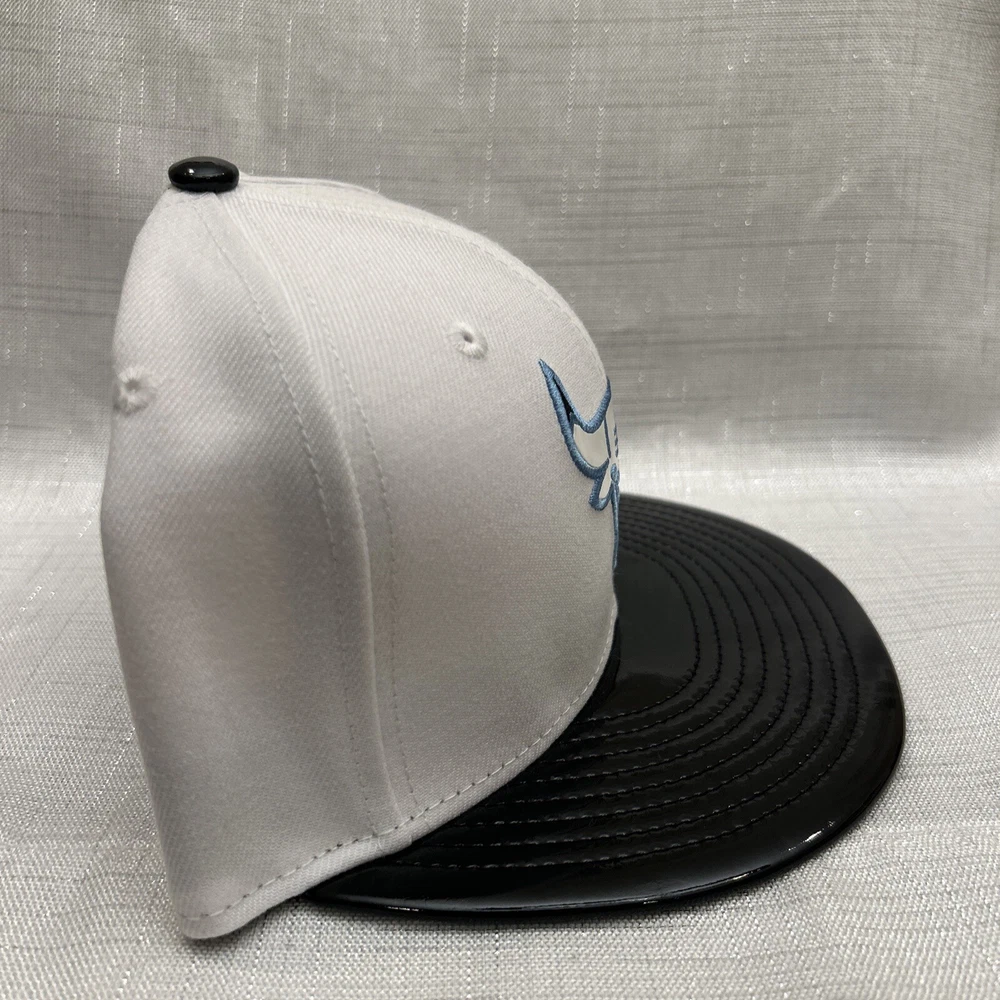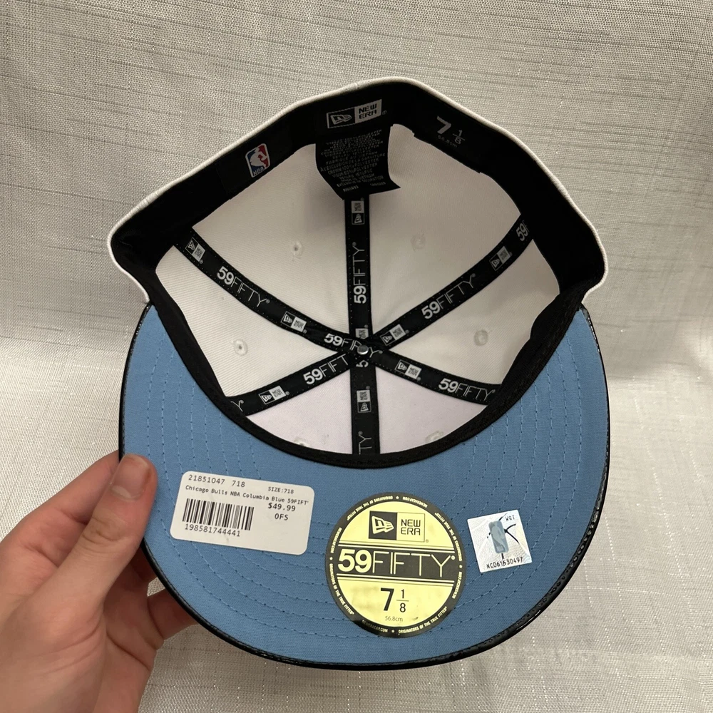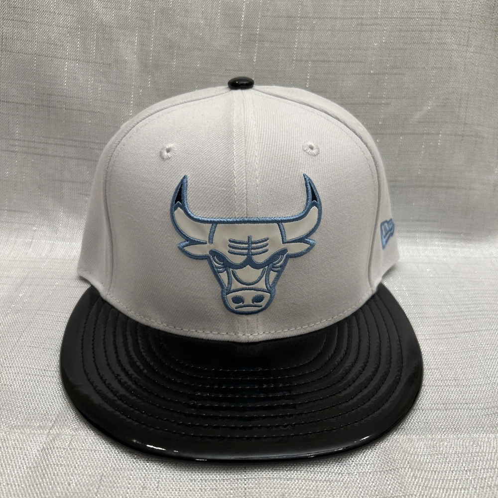 The product is a New Era 59FIFTY Fitted Cap featuring a patent leather design in black and blue, with the Chicago Bulls team logo. It is size 7 1/8 and designed for men. Perfect for fans of the Chicago Bulls in the NBA, this cap is a stylish way to show support for the team.