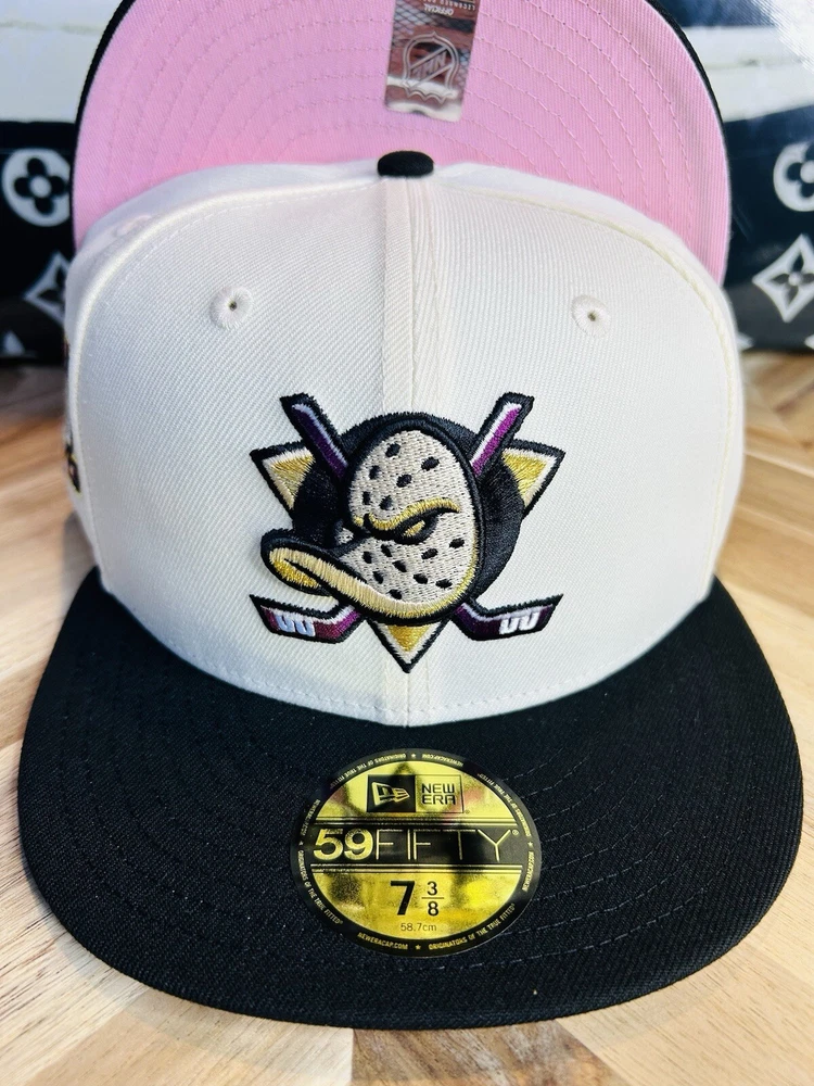 This New Era Prociety Rahnni Mighty Ducks NHL White Hat 7 3/8 in Pink UV Rare Sold Out is a must-have for any sports fan. The hat features an upside-down logo and is made of 100% polyester fabric, making it durable and comfortable to wear. It is perfect for any occasion, whether it's a game or a casual day out. The hat is designed with a solid pattern and is available in a classic white color. It is a men's accessory and is ideal for those who want to showcase their love for the Mighty Ducks. This hat is exclusive, rare, and sold out, making it a perfect addition to any collection.