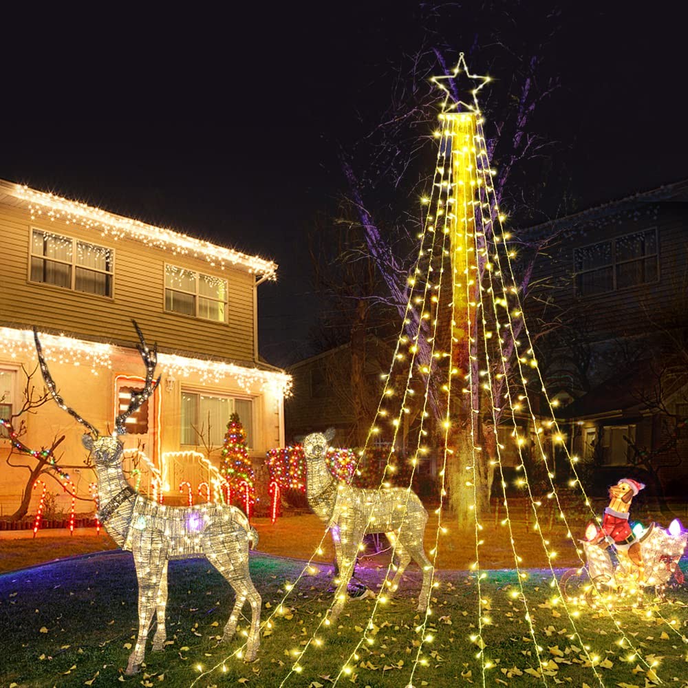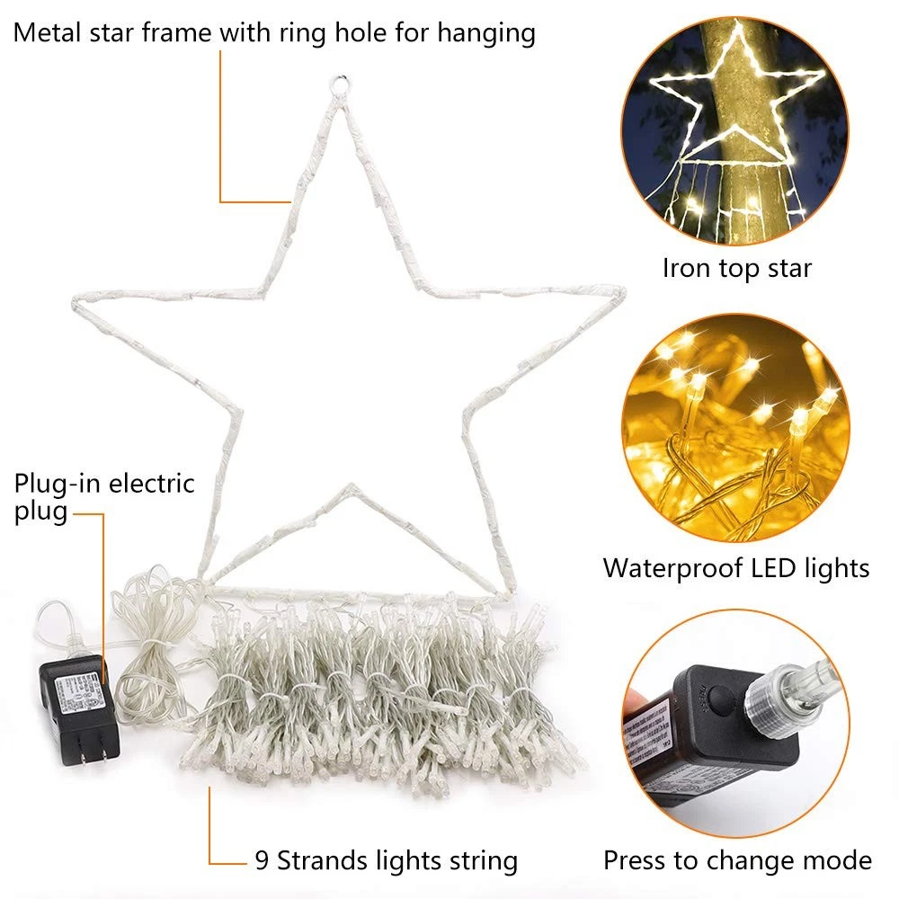 FuNiao Outdoor Christmas Decorations Star String Lights 320 LED Waterfall Christmas Tree Lights Outside Christmas Decorations Lights The christmas tree top star lights work great with trees from around 8 feet to 13 feet tall. You can also hang the star lights under the eaves, gutter or porch, place them on fences and stair posts, illuminate windows, arrange on bedroom shelves or furniture, etc. Light up Your Christmas with this star string lights! Perfect indoor and outdoor decoration for Christmas tree, wedding, New Year, holiday, birthday, party, festival, bedroom, backdrops, porch, patio, house, stage, etc. Specification: - Total number of bulbs: 320 - Total strands of lights: 9 strands - Total number of bulbs on each strand: 32 led - Space between each bulb: 0.29ft - Topper star is lighted with 29 led lights - Size: Pentagram Star in 12.6in, each string light length 10.4ft, plug cable length 16.4ft - Voltage: 29V safe low voltage (Includes UL plug-in transformer) - Power source: Plug-in electric - IP44 Waterproof ★【320 LED Christmas Star Lights】 320 LEDs, 1 top pentagram star with a tail of 9 strand strings of 32 led each, the large star ornaments is 12.6in, each string drops 10.4ft. Plug cable length:16.4ft. Light up your house or yard with the Christmas star string lights! ★【Curtain/Outdoor Waterfall Lights】FUNIAO star string lights work great with trees from around 8 feet to 13 feet tall. You can also hang the treetop star string light to decor your curtain, room, and window. Just hanging the big star about 10 feet up on an exterior curtain/wall/tree, and then drape the 9-star string lights down to the ground. You can also hang them sideways more like a shooting star. Ideal outdoor indoor decorations. ★【8 Lighting Modes & IP44 Waterproof】 The Christmas decorations outdoor star lights have 8 different light patterns: combination, in waves, sequential, slo-glo, chasing/flash, slow fade, twinkle/flash, and steady on. IP44 waterproof waterfall Christmas cone tree light is perfect for indoor and outdoor decorations. ★【Easy & Safety to Use】 Directly plug in and unplug the outside Christmas decorations star lights for power on and off. With a 30V low voltage adapter, this Christmas starlight is safe to touch and will keep at a low-temperature state after lighting up for hours. Safe, power-saving, and eco-friendly. ★【Ideal Gift & Decoration Choice】The Christmas tree star lights can be used as large outdoor tree ornaments, yard Christmas ornaments outdoors, as a Christmas present for your family, loves, friends, colleagues for New Year, birthday, wedding, anniversary, etc. Very beautiful lighted Christmas display for holiday decorations. Enjoy 1 year , any problem, please us.