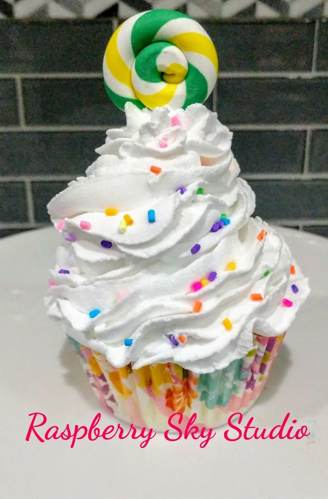 Realistic looking single or set of 3 handmade faux/fake cupcakes with "white icing" ,"rainbow sprinkles, and a "lollipop" on top. **********Please note lollipop color is random - This item is for decorative purposes Only. It is NOT Edible and is NOT meant to be played with. -This item is custom made for each order so it may vary slightly from the photo shown. -Customization is available upon request. Otherwise item will be made as shown in the photo unless otherwise noted. -Please allow 10 days for your item to be shipped as many items are made to order. -Please feel free to contact me with any questions. An original Raspberry Sky Studio Design Get Social with Us!!! Facebook- www.facebook.com/RaspberrySkyStudio Instagram- RaspberrySkyStudio Pinterest- www.pinterest.com/RaspberrySkyStudio Our items come from a clean and smoke free home. Please feel free to ask if you have any questions.