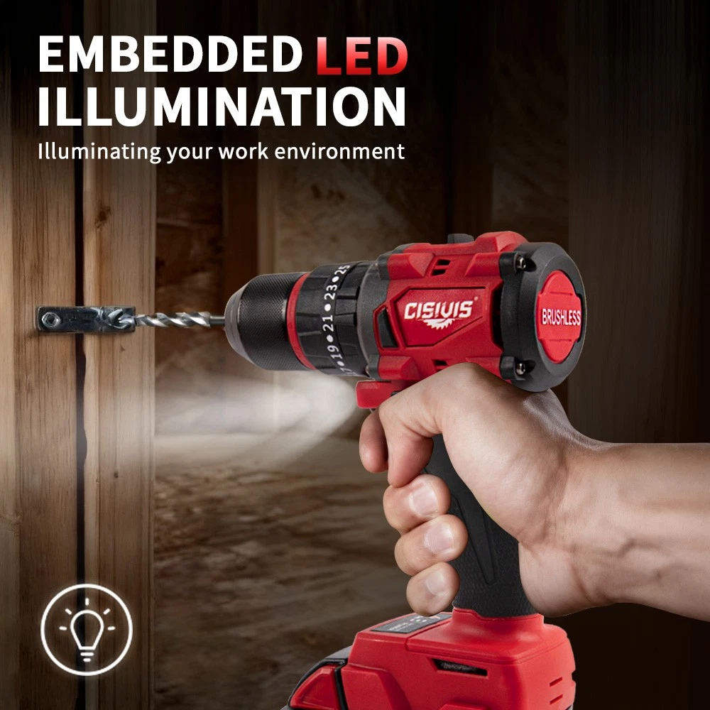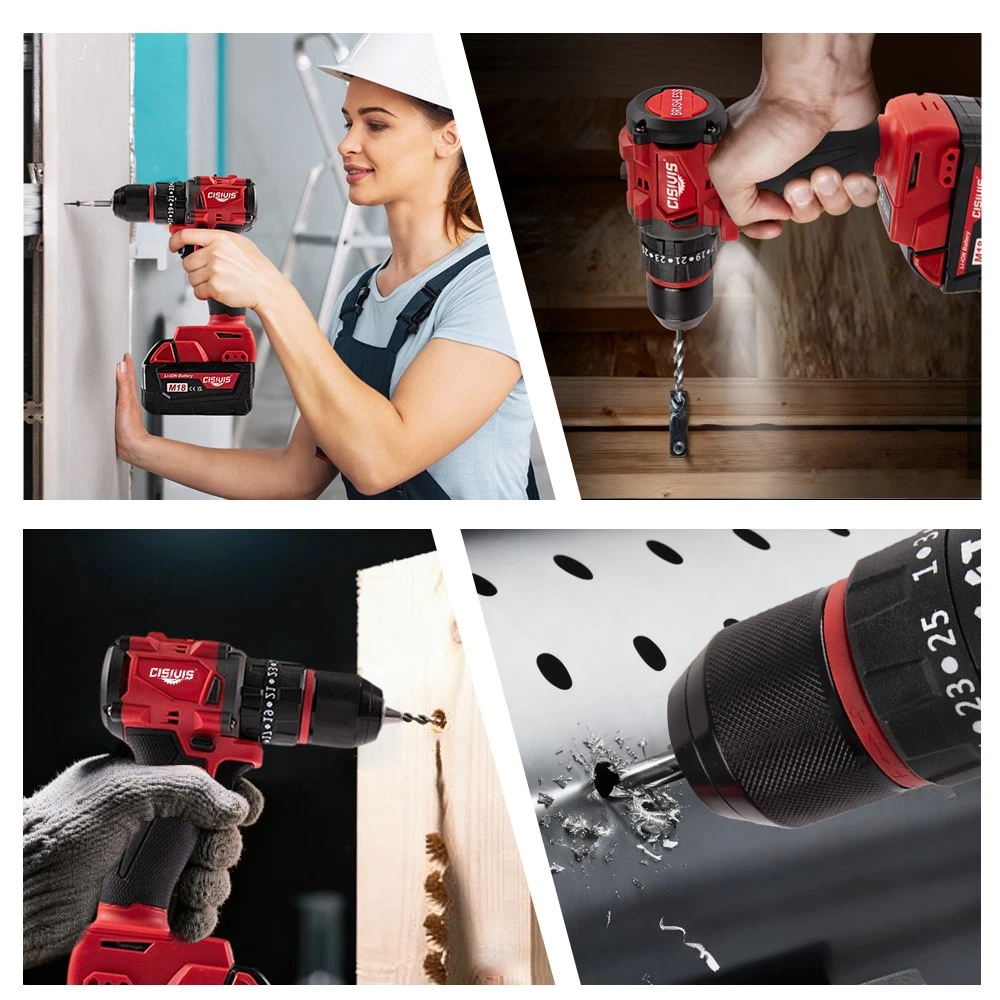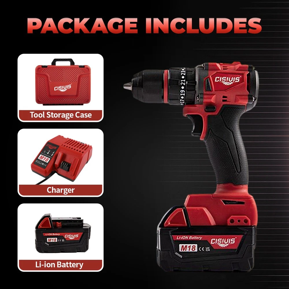 Complete Ready-to-Work Kit - Includes Battery & Charger! Get ready to drill and drive right out of the box! The CISIVIS 45N.m Cordless Drill Driver comes as a complete kit with everything you need to start your projects immediately. No need to own existing batteries - this full set delivers professional performance for DIY enthusiasts and professionals alike. Features: COMPLETE READY-TO-USE KIT : Includes M18 battery and fast charger 45N.m MAX TORQUE : Perfect balance of power and control for all tasks 2-SPEED GEARBOX : High speed (0-9500 RPM) for drilling, low (0-3500 RPM) for driving 25+3 PRECISION CLUTCH : Prevents screw stripping and over-driving 13MM ALL-METAL CHUCK : Maximum durability and bit retention BRUSHLESS MOTOR : 50% longer runtime vs brushed motors BUILT-IN WORK LIGHT : LED illuminates dark work spaces ERGONOMIC GRIP : Comfortable handling during extended use What's Included: CISIVIS Drill Driver (Tool Only) M18 Lithium-Ion Battery * 1 Fast Charger * 1 Durable Storage Case * 1 User Manual * 1 Technical Specifications: Maximum Torque: 45N.m No-Load Speed: 0-3500/0-9500 RPM Chuck Size: 13mm Battery: M18 Lithium-Ion (Included) Charger: Fast Charger Perfect For: HOME DIY : Furniture assembly, shelf installation, repairs CONSTRUCTION : Drywall, framing, deck building WOODWORKING : Cabinetry, trim work, hobby projects AUTOMOTIVE : Interior work, repairs, modifications RENOVATION : Remodeling projects of all sizes Why Choose This Complete Kit? READY IMMEDIATELY : No additional purchases needed GREAT VALUE : Save vs buying tool and battery separately PROFESSIONAL POWER : Handles 90% of drilling/driving tasks EASY STORAGE : Durable case keeps everything organized