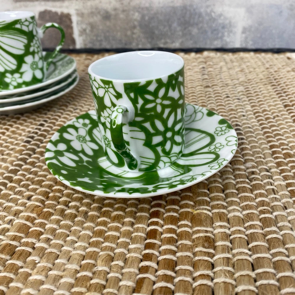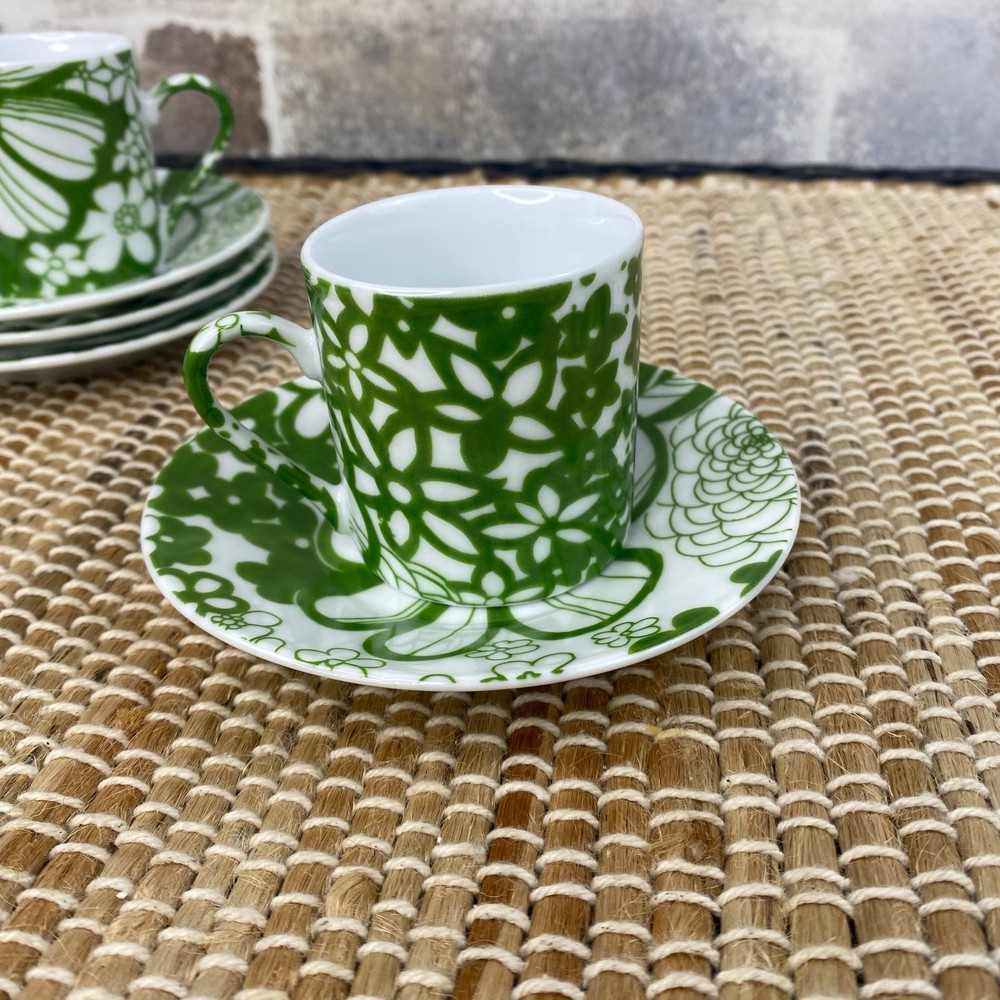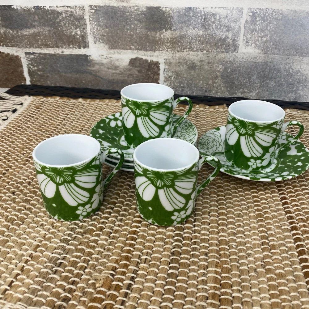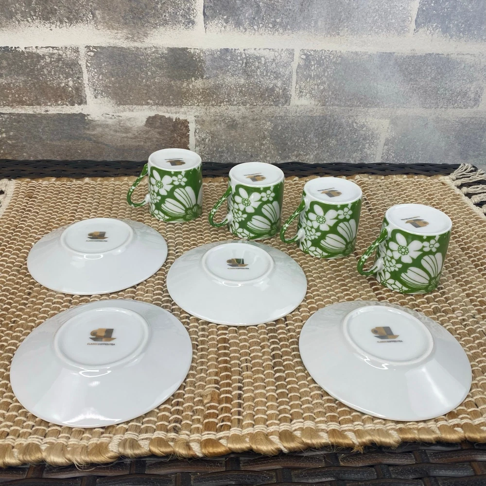 Four Demitasse Cups and four Saucers Classic Coffee & Tea Use for serving strong coffee like Espresso or Turkish Coffee In Green and White Floral Cups measure approx 2 1/8" tall and 1 7/8" diameter Cups are approx 2 ounces Saucer is approx 4.5" in diameter Never used