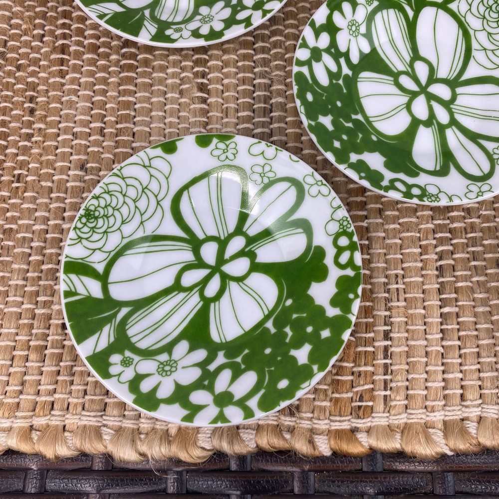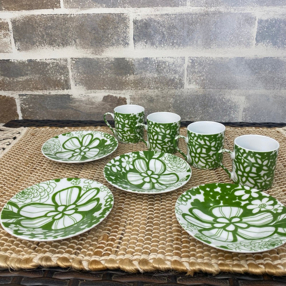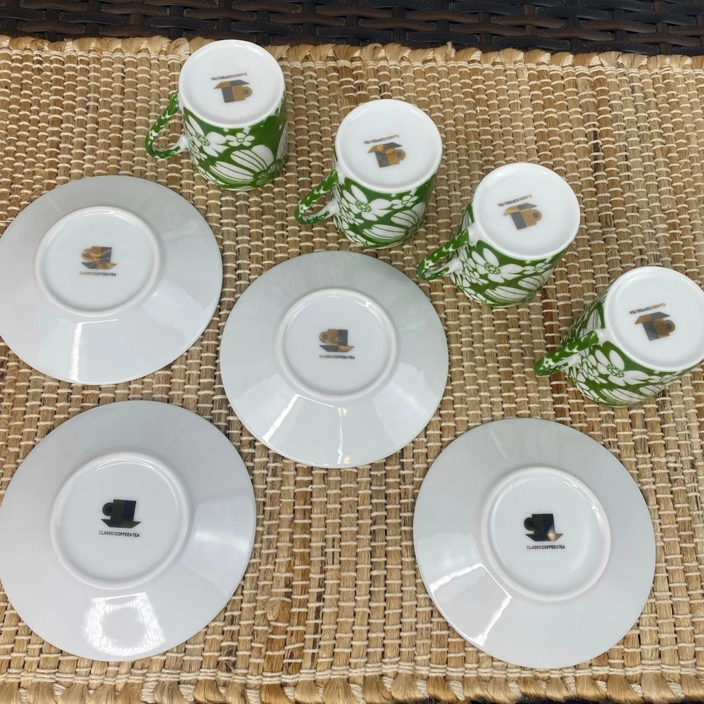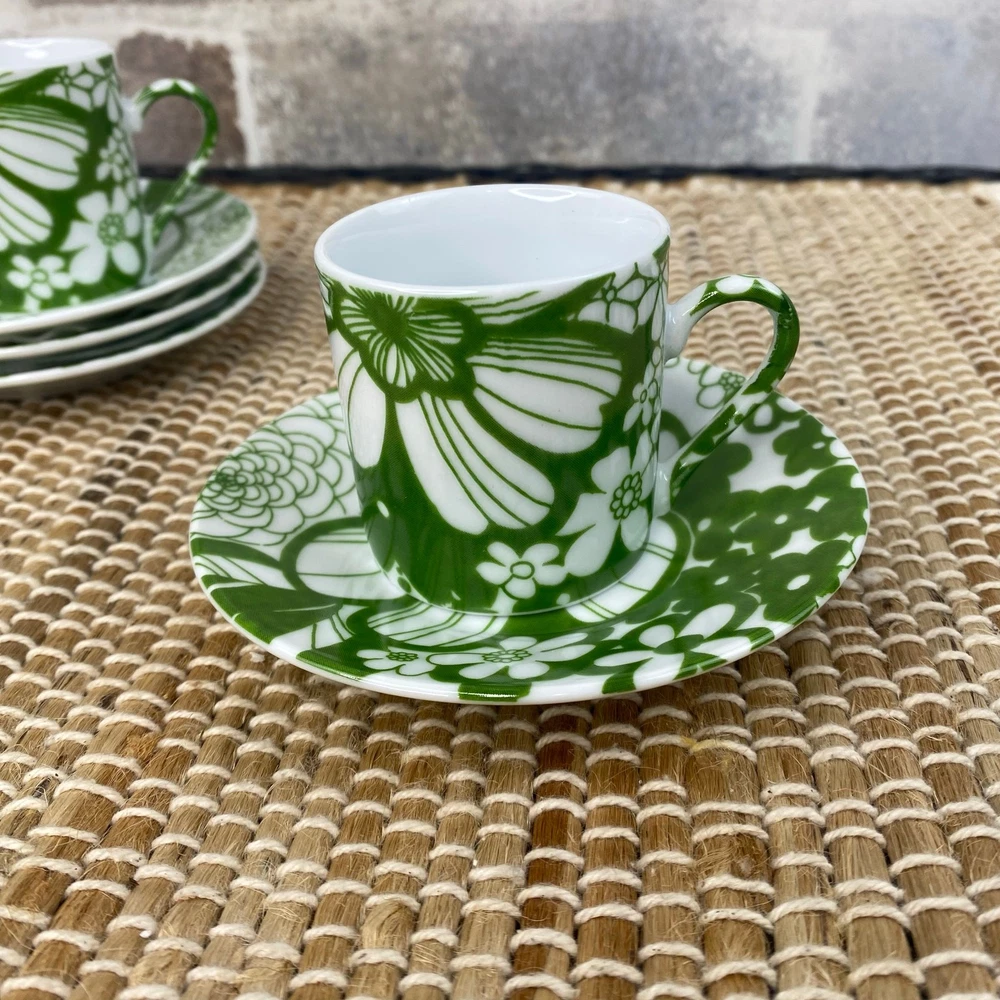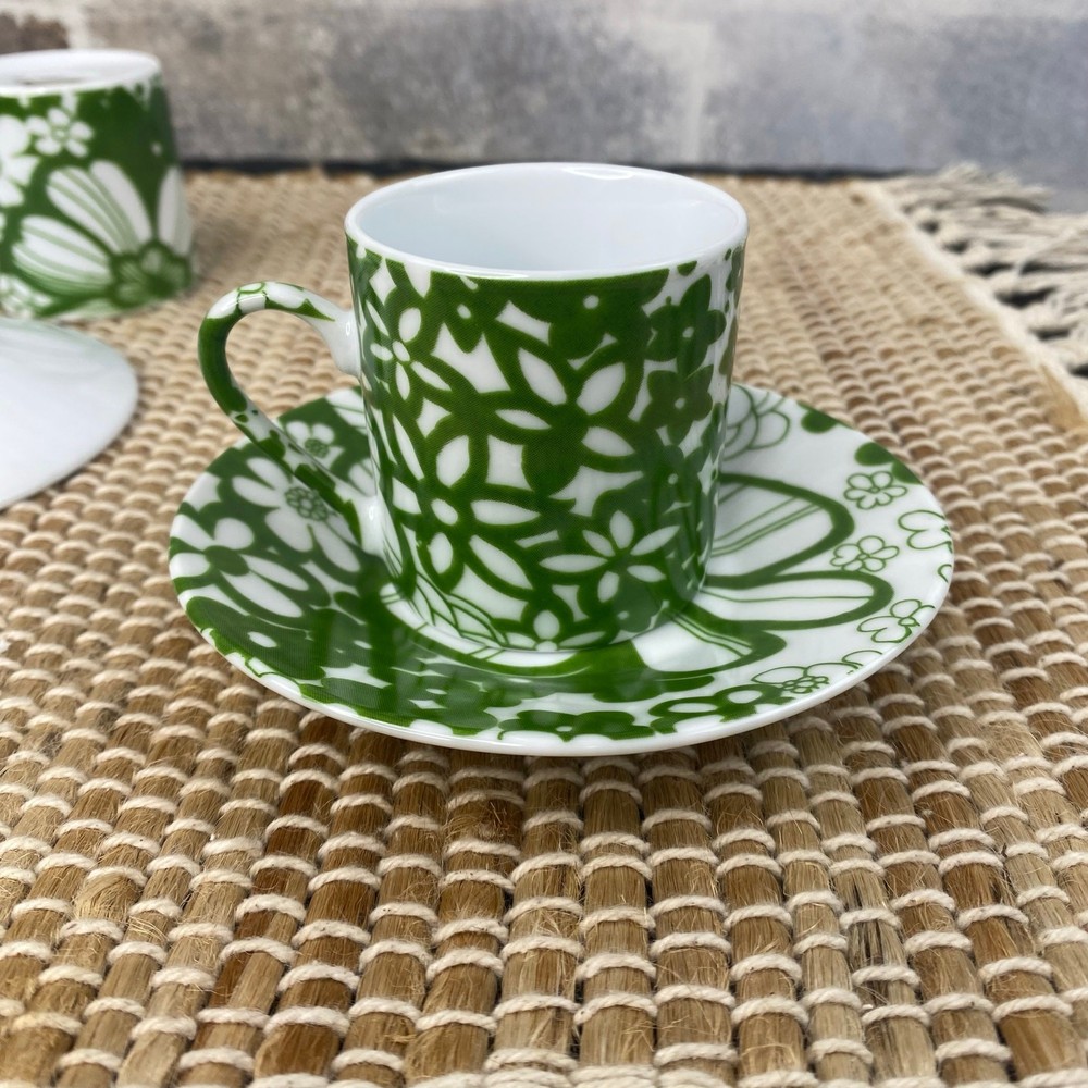 Four Demitasse Cups and four Saucers Classic Coffee & Tea Use for serving strong coffee like Espresso or Turkish Coffee In Green and White Floral Cups measure approx 2 1/8" tall and 1 7/8" diameter Cups are approx 2 ounces Saucer is approx 4.5" in diameter Never used