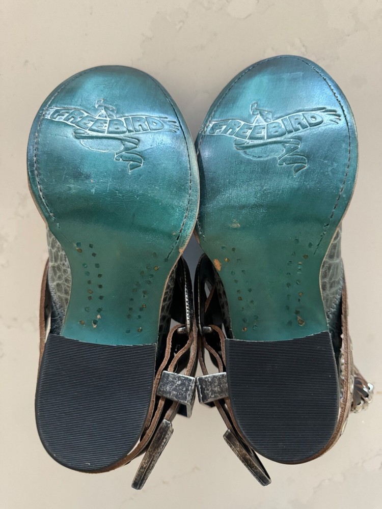 Brand new without box Unleash your wild side with these chic Freebird Saloon Boots, a blend of edgy style and undeniable comfort. Crafted with a vibrant teal leather upper adorned with an eye-catching animal print, these ankle boots are a bold statement piece for any wardrobe. The pointed toe and mid-height block heel offer a sleek silhouette that's perfect for a variety of occasions. Attention to detail is evident in the boots' design, from the smooth leather lining to the secure-zip closure, ensuring a snug and comfortable fit. The durable leather outsole is made to last, making these boots a reliable addition to your shoe collection. Whether you're channeling a Western vibe or just looking for a standout pair of boots, these Freebirds are sure to impress.