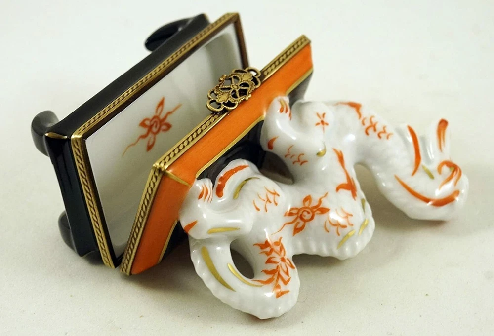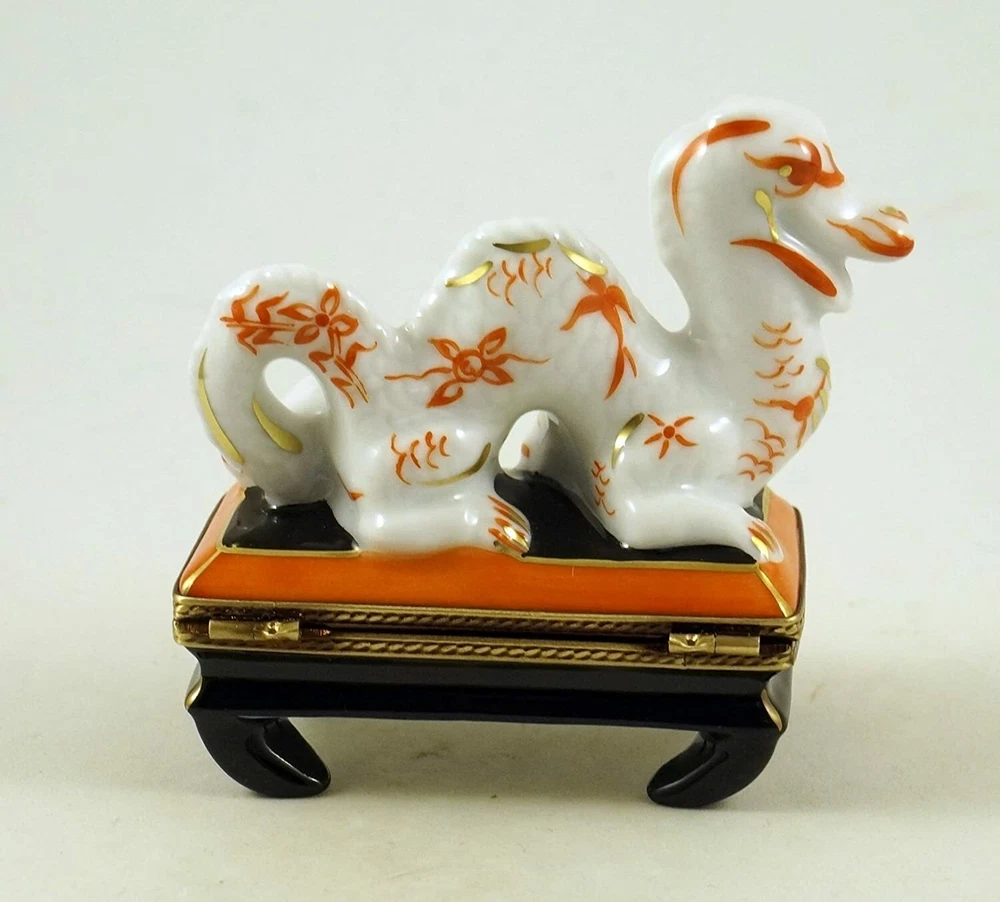 PLEASE ZOOM ON THE SECOND PHOTO TO VIEW SOME LIMOGES BOXES FROM OUR EASTER COLLECTION! NEW !!! AMAZING AND ORIGINAL GIFT !!! HIGH QUALITY!!! YEAR OF DRAGON Authentic French porcelain LIMOGES BOX AMAZING COLORFUL ASIAN Chinoiserie DRAGON - SYMBOL OF GOOD FORTUNE is new and entirely made and decorated in the City of Limoges, France. The dragon is also a symbol of power, strength and good luck. is new and entirely made and decorated in the City of Limoges, France. Measures 3 " L. Hand painting is evidenced on every surface of this amazing Limoges box - beautiful work of art. This wonderful Limoges box is marked LIMOGES FRANCE, Peint Main (Hand painted) and signed by the artist. Comes gift boxed with a Certificate of Authenticity . What a great box to add to your collection! What a wonderful and original gift! PLEASE VIEW OUR OTHER BEAUTIFUL AUTHENTIC FRENCH LIMOGES BOXES IMPORTED FROM LIMOGES FRANCE IN OUR AUCTION AND STORE LISTINGS. WE PROVIDE PROFESSIONAL PACKAGING AND PROMPT SHIPPING OF OUR HIGH QUALITY FRAGILE ITEMS. Shipping is FREE in 48 continental States. Payment is due within 2 days after the end of the auction. Happy bidding! A few words about amazing Authentic French porcelain Limoges boxes... Authentic French porcelain Limoges boxes are highly collectible miniature hinged trinket boxes - gorgeous, detailed, exquisitely hand painted works of art. Kaolin - the "secret ingredient" of fine porcelain was discovered in Limoges, France. Limoges, Meissen and Sevres became the porcelain manufacturers royalty had to own. Limoges porcelain boxes are still handmade and hand painted by artists as they were three hundred years ago. These amazing fine art objects are created in different shapes and colors (beautiful rare music boxes, classical, detailed animals, art, baby, birds, beach, books, casino, dance, fashion, food, games, garden, home furniture, judaica, music, patriotic, perfume, portraits, sea treasures, sports, tea time, travel, fruits, vegetables, etc.) for different occasions (Birthday, Wedding, Christmas, Chanukah, Easter, New Years, Halloween, Independence Day, Thanksgiving, Valentine's Day, Mother's Day, Father's Day, St, Patrick's Day, etc.). Please visit our store I&R GIFTS INTERNATIONAL often where you can purchase unique and amazing gifts for any occasion!