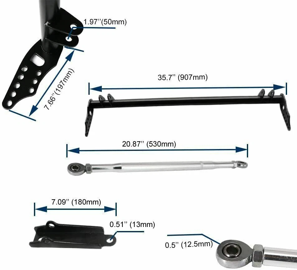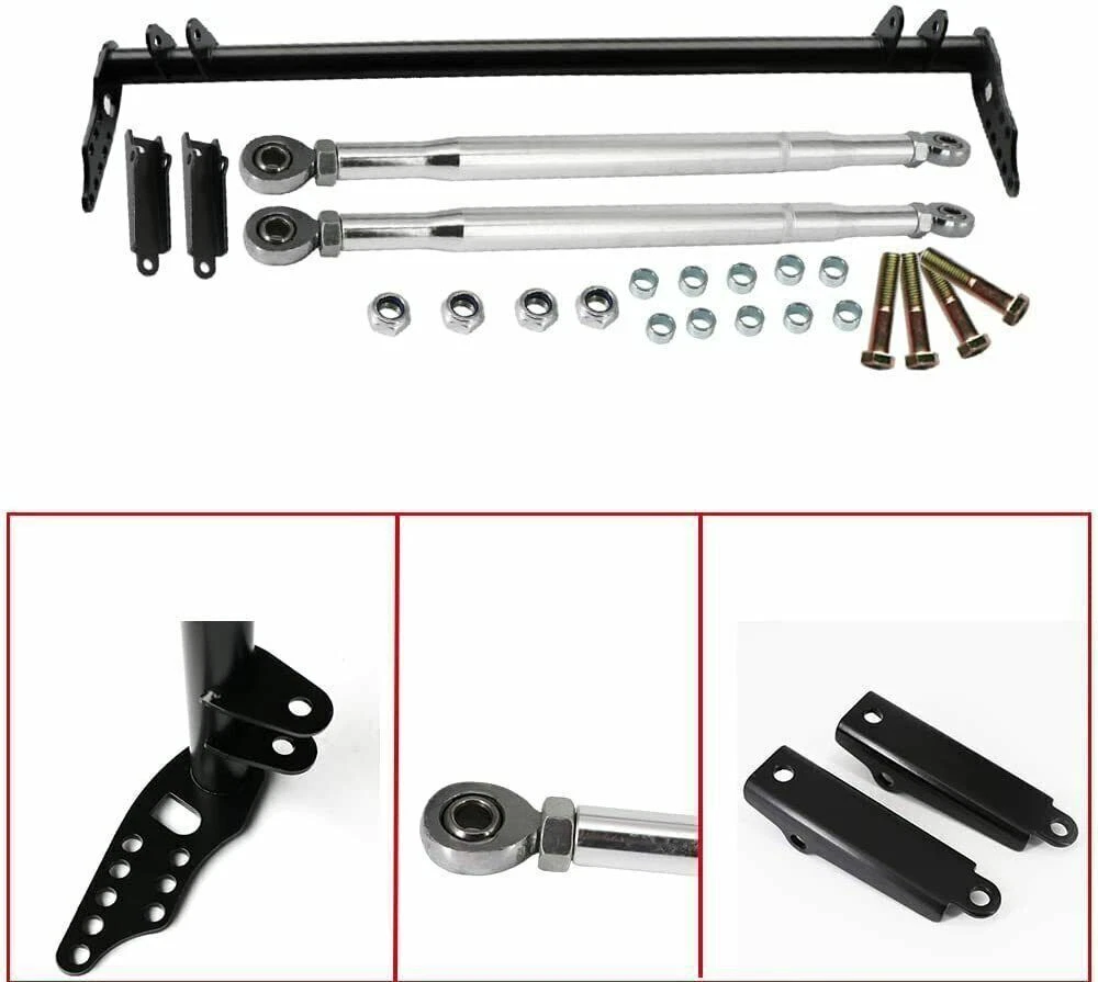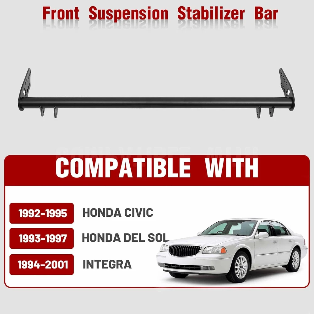 Front Traction Control Tie Bar Kit Fit for Honda Civic 92-95 Acura Integra 94-01 Item Description 【Fitment】: Suspension Traction Control Tie Bar Arm Kit fits for Honda Civic 5th EG, EH, EJ1/2. 1992 1993 1994 1995, for Honda Civic 6th EK3/4/5/9, EJ6/7/8/9, EM1. 1996 1997 1998 1999 2000, for Honda Del Sol. 1993 1994 1995 1996 1997, for Acura Integra DC. 1994 1994 1995 1996 1997 1998 1999 2000 2001. 【High-quality Material】: The Traction Control Tie Bar is made of high quality steel and aluminium structure for high strength and durability. And the suspension lower tie bar adopts a powder coating process to ensure stable performance and long-lasting lifespan. 【Function】: The Traction Bar is designed to increase the rigidity and stability of a vehicle's front suspension. Prevent the spring from tightening when it breaks. It reduces unnecessary movement and can better deal with acceleration, turning and bumps. 【Easy to install】: After installing the drawbar, the front suspension will become harder, thus increasing the traction to the ground, saving time and improving use efficiency. 【Adjustable Angle】: The front traction suspension control lower tie bar brace kit can rotate 360 degrees to maintain a high degree of flexibility in order to better cope with acceleration, rolling and bumps. Installation steps Remove the old crossmember Remove both front tow hooks. Mount the Traction bar without the radius arms. Install radius arms. Bolt the front first where it goes on the bar loosen up the nut on the heims and adjust length until the holes line up to the top of the front lower control arm (be sure to count the threads on the heims to make sure both side is equal length) Tighten up all bolts and make sure to not forget the nut on the heims. Specifications Condition:100% Brand New Warranty: 90 Day Material: T-304 light weight stainless steel Color: Black Fitment Front Traction Suspension Control Lower Tie Bar Kit Comepatible with 1992 1993 1994 1995 Honda Civic 5th EG, EH, EJ1/2. Comepatible with 1996 1997 1998 1999 2000 Honda Civic 6th EK3/4/5/9, EJ6/7/8/9, EM1. Comepatible with 1993 1994 1995 1996 1997 Honda Del Sol. Comepatible with 1994 1994 1995 1996 1997 1998 1999 2000 2001 Acura Integra DC. Please Double-Check that this is compatible with your vehicle. Package Included 1 Pc Cross Bar 2 Pcs Tie Bar 2 Pcs Bracket 1 Pc Accessory Pack As pictures show FAQ: I purchased by mistake, how do I cancel the order? Please contact us ASAP. If the item has not been shipped out we can cancel the order for you. If the item was shipped out you can refuse the package and wait for the item to return to us. I received your item but it does not fit or is defective Please contact us so we can assist you on the matter. Buy with confidence Our quality is based on meeting the requirements of the manufacturer and improvement them in design problems manufacture. NOTE: (1)It would be highly appreciated if you might contact us first once you have any problems concerning the items. And you can expect all the issues would be resolved ASAP! (2)Please let us know before you send us the neutral/negative feedback that wont help to finish the issues. And I will definitely try my best to provide the best solutions which would meet our satisfactory! (3)According to the distance of the receipt address items would be sent from CA or NJ