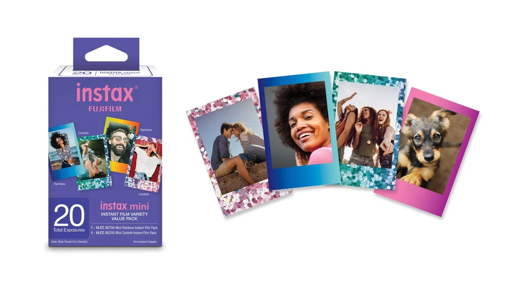 The Fujifilm INSTAX Mini Film Value Pack contains two FujifilmINSTAX fan favorites, Rainbow and Confetti film. Adding the perfect splash of color, Rainbow film and its vibrant gradient borders, is ideal for those fun and spontaneous moments. Confetti film is great for those special celebratory memories, adding just the right touch with its colorful confetti textures. Fujifilm INSTAX Mini Film 20CT Value Pack… instant film, endless fun. Fujifilm INSTAX Mini Film offers stunning-quality instant pictures that fit perfectly in a wallet or mini photo frame. Professional quality instant film technology ensures accurate color and sharpness with every picture—not to mention a unique and highly attractive way to capture and share your memories. Fujifilm INSTAX Instant Mini film is compatible with all Fujifilm INSTAX Mini instant cameras and Fujifilm INSTAX Mini Smartphone printers. This value pack includes: 1 Fujifilm INSTAX Mini Rainbow Film Pack (10 Total Exposures), 1 Fujifilm INSTAX Mini Confetti Film Pack (10 Total Exposures). Fujifilm Instax Mini Film 20 count Value Pack is compatible with all INSTAX Mini instant cameras and INSTAX Mini Smartphone printers Fast Picture Development. This value pack includes 1 Fujifilm INSTAX Mini Rainbow Film Pack (10 Total Exposures) and 1 Fujifilm INSTAX Mini Confetti Film Pack (10 Total Exposures) Develops in approximately 90 seconds; High-Speed ISO 800 film; Print Size: 54mm x 85mm, Image size: 46mm x 62mm