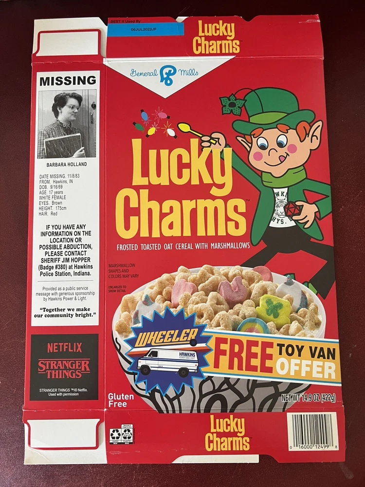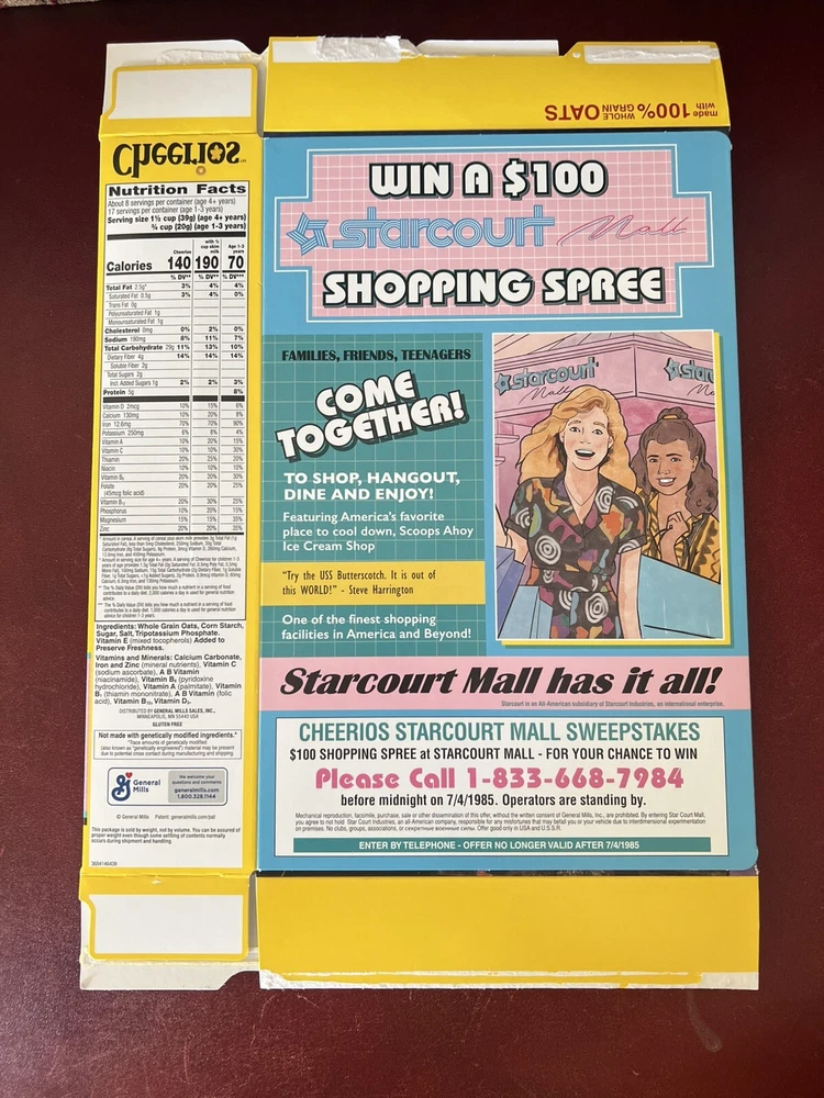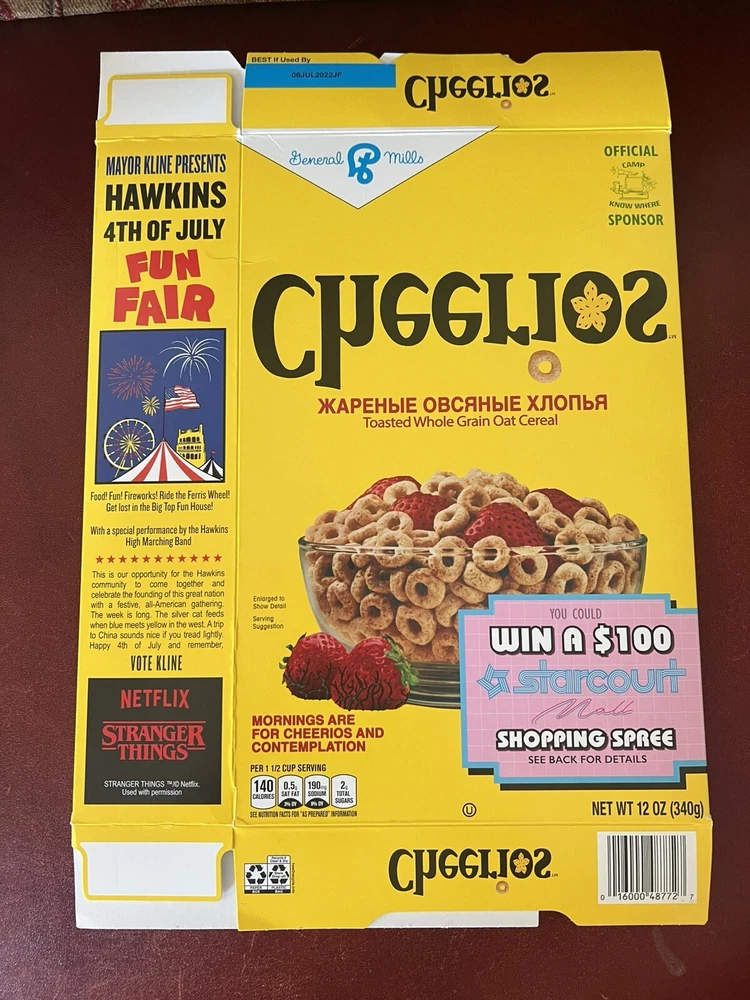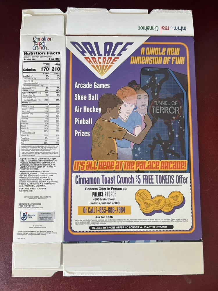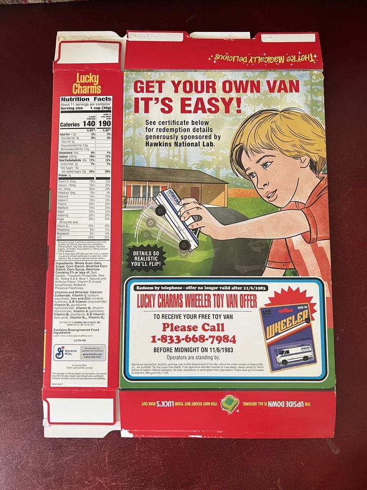 This limited edition General Mills Netflix Shop Stranger Things Cereal Box Set features three different cereal boxes (flat packed), each with a unique design inspired by the popular series. The set includes Lucky Charms, Cinnamon Toast Crunch, and Cheerios, all with colorful and eye-catching packaging that will make them a great addition to any collection. Each box has a limited edition run of 1500, making them a rare find for any fan of the show or cereal collector. The boxes are in great condition but have previously been opened. There is some glue markings at the bottom of the Cinnamon Toast Crunch box that is noticeable but if you put it back into box form it wouldn’t be seen. The cereal inside was just normal cheerios, lucky charms and Cinnamon Toast Crunch. They were not special pieces of any kinds. The boxes ship flat packed. They can be molded back into their original box form or framed to show them flat. You decide. They were created in 2021 as an original piece of merchandise for the Stranger Things series. Whether you're a fan of the show or just love collecting unique cereal boxes, this set is a must-have.