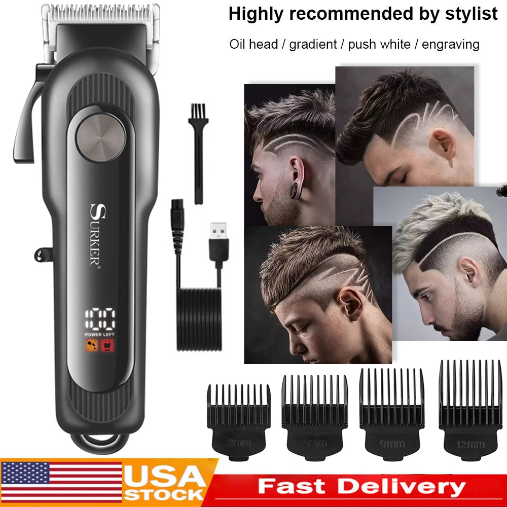Product details: 1 Using high quality steel, sharp and durable. 2: limit comb * 4 (3/6/9/12mm) 3: The R-type blade safely, cuts hair easily and does not hurt the skin. 4: waterproof design, easy to clean. 5: Large capacity lithium battery can work up to 240 minutes. Product parameters : Brand: Surker Product Name:SK-911 Body weight: 252g Color box size: 23.5*6.5*14cm Machine size: 19*5/7.4*1.9 Inch Color: Black / Grey Voltage: 110-240V 50/60HZ Power 5W, Use Time: Charge 3 hours , Use 150 mins Include: host*1 USB cable*1 limit comb*4, cleaning brush*1
