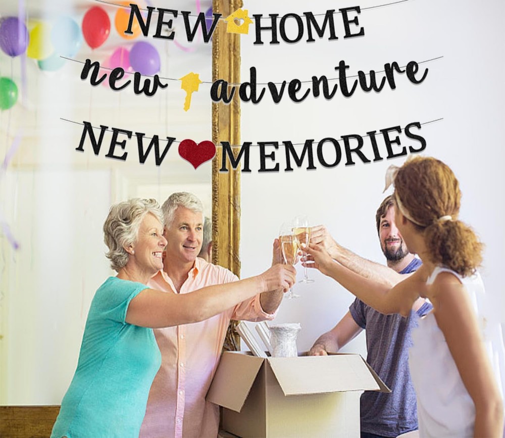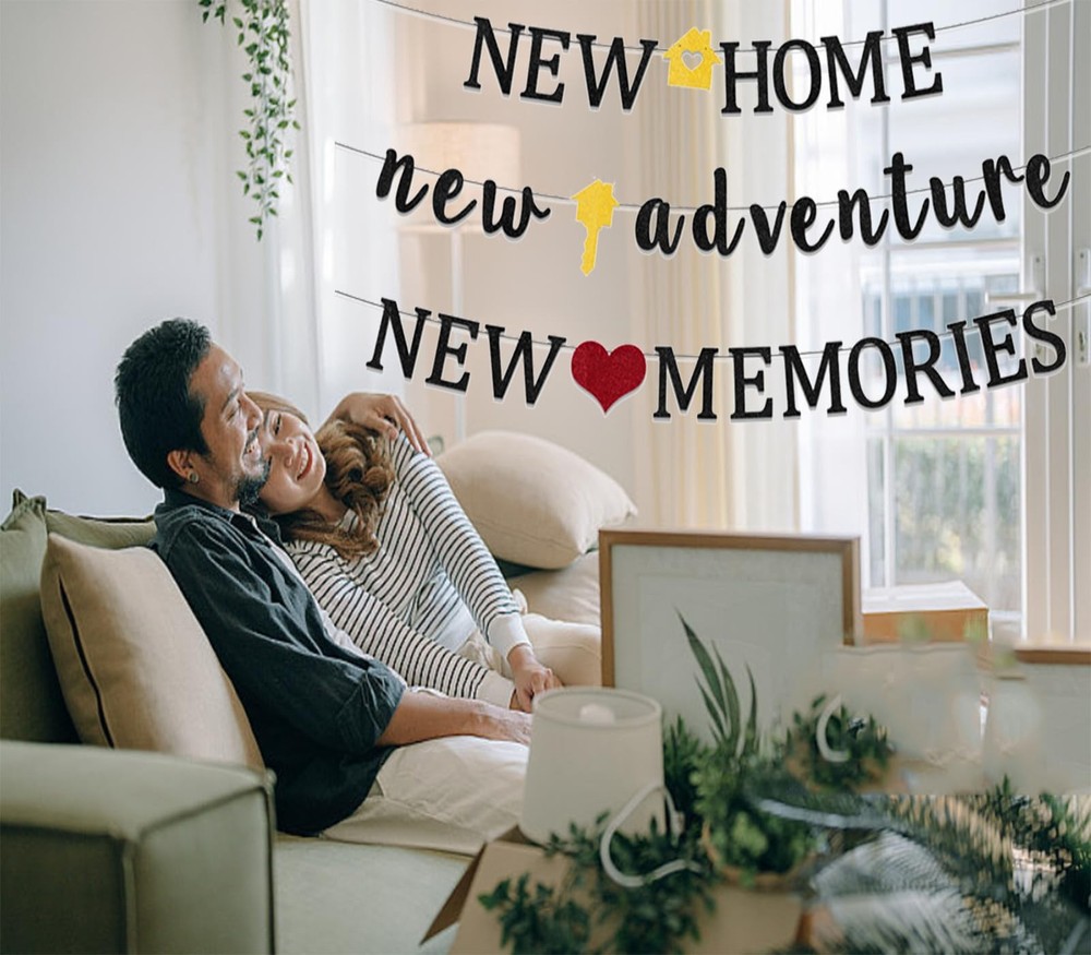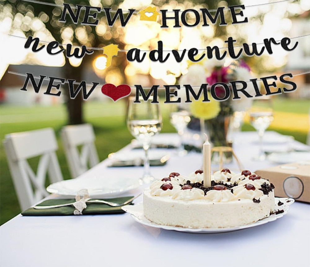 New Home New Adventure New Memories Banner for House Warming Party Decorations Features: PREMIUM PARTY BANNER: Pre-strung black glitter text on durable material makes setup quick and hassle-free for your celebration PERFECT SIZE: Banner measures approximately 6 feet in length, making it an eye-catching centerpiece for any party space HUMOROUS DESIGN: Features the funny phrase "New Home New Adventure New Memories Banner " in sparkly gold letters for a memorable milestone celebration VERSATILE DISPLAY: Includes hanging strings on both ends for easy mounting on walls, between posts, or across doorways COMPLETE DECORATION: Ready to use right out of the package - no assembly required, perfect for indoor or outdoor birthday celebrations SHIPPING We are always working hard to ensure your package arrives as soon as possible. Please understand that some factors like weather, high postal traffic, and the performance of shipping companies are outside of our control. We offer free shipping to the lower 48 states and ship within 3 business days of payment, usually sooner. We do not accept P.O. Boxes. Please provide a physical address.