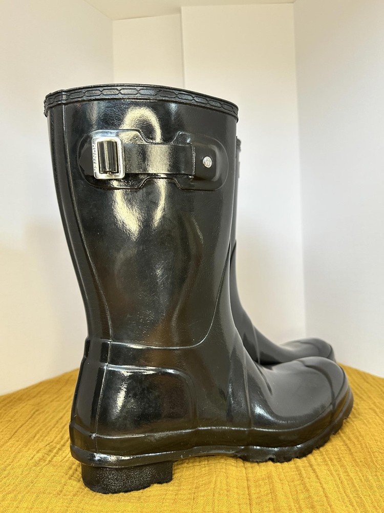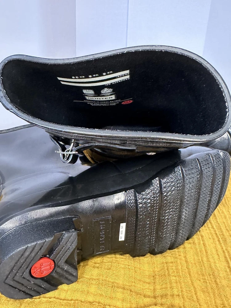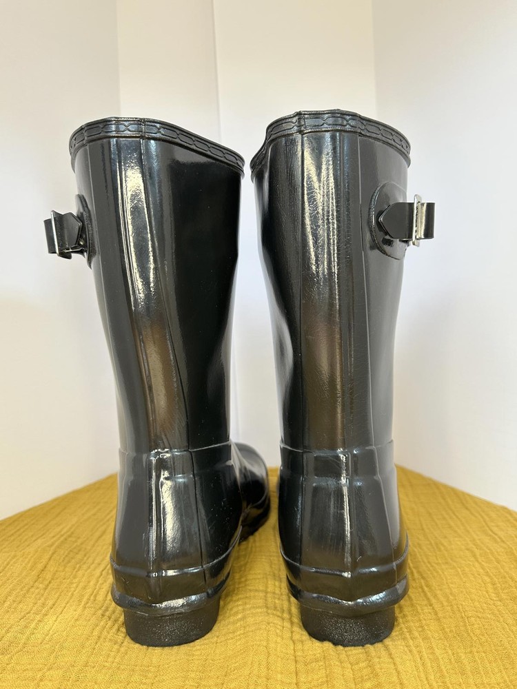 Get ready to tackle the rain in style with these Hunter Original Black Rain Boots in Original Gloss! The Women's Original Short Rain Boot is a shorter version of the iconic Hunter Original Tall Boot and perfect for wet-weather conditions. Formed of natural rubber, each boot is handcrafted and assembled over three days and then vulcanised for superior protection before having the high gloss finish applied. The Hunter Original tread pattern and comfortable 100% recycled polyester lining completes the design on this 100% waterproof boot. - Classic black color for versatile styling - Adjustable strap for a customizable fit - Durable construction for longevity - Textured sole for enhanced traction on slippery surfaces