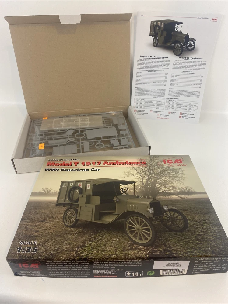ICM Model T 1917 Ambulance WWI American Car Model Kit Brand New Made in Ukraine Recommend for adult collectors over the age of 14.Choking hazard for small children and pets.See photos for complete description We welcome your questions, and offer hassle free returns within 30 days. Items must be in original condition.