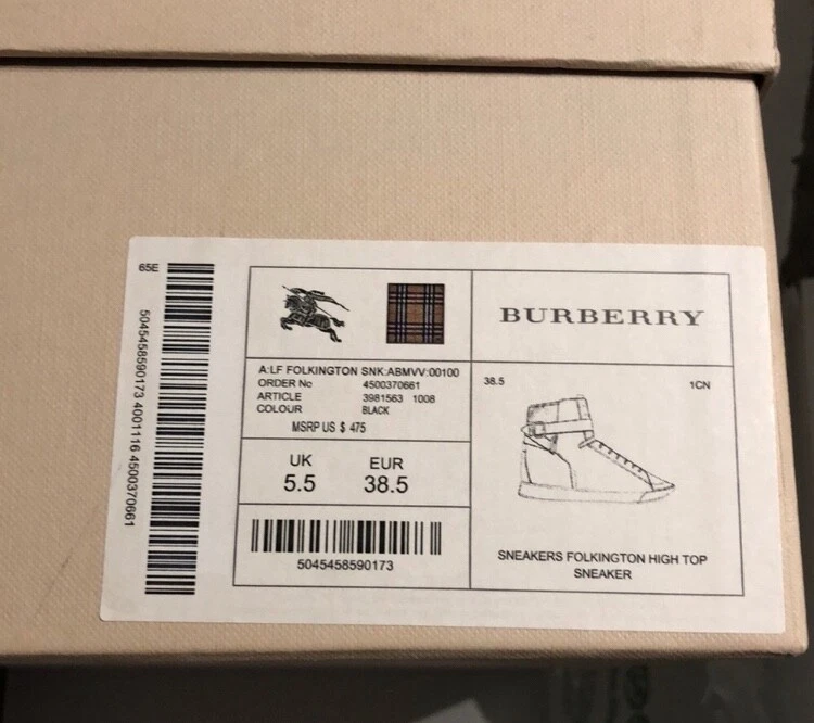 New In Box - Authentic Burberry high top sneakers. Elevate your casual style with these black leather high top sneakers from Burberry. Designed for comfort and performance, these sneakers feature a high top shaft style and are perfect for boxing enthusiasts. The US shoe size is 8.5, making them ideal for women looking for a stylish and functional addition to their wardrobe.