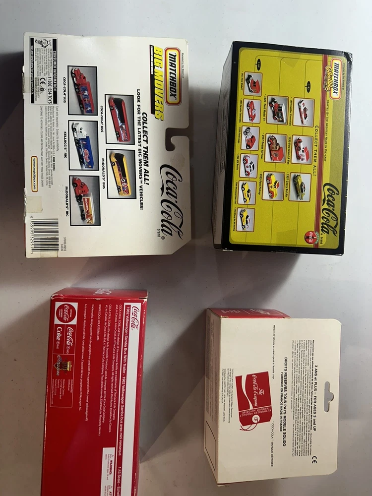 Brand new lot of 4 Match boxs big movers is damage box you can see in the picture This lot of 4 collectible cars from Motor City Classics is a must-have for any Coca-Cola or diecast car enthusiast. The set includes a VW Samba bus, Matchbox cars, and is all in its original packaging. The cars are in great shape and have not been customized or autographed. The color of the cars is a vibrant red, with a 1:43 scale model of the VW Samba bus. This set is perfect for collectors or as a gift for someone who loves cars or Coca-Cola memorabilia. Don't miss out on adding this unique set to your collection.