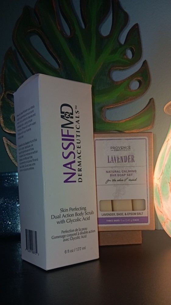 NEW IN BOX FULL SIZE NassifMD Dermascueticals Skin Perfecting Dual Action Body Scrub with Glycolic Acid 6 fl oz. Provence 3pck Lavender Natural Calming Bar Soap Set Bar Soap 5 oz each bar