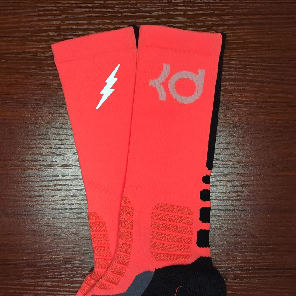 KD Nike Hyper Elite Socks Orange/Black Size Large Brand new without tags 100% Authentic Fast Shipping: Ships in 1-2 business days from Illinois Many colors available, check out my page to see them all Message me with any questions The Nike Elite Basketball Crew Socks feature Dri-Fit fabric that keeps your feet cool and comfortable. It’s made for durability and offers a supportive and snug fit. The Nike Elite Basketball Crew Sock is a must own for any basketball player. Perfect for basketball, volleyball, and other sports Pair different colorways with your Kobe's, Lebron's, KD's and more. Performance basketball crew socks deliver superior fit and comfort. Strategically placed cushioning absorbs impact Dri-Fit technology helps keep feet feeling dry and comfortable. Left/right anatomical design for targeted comfort. Ventilation zones promote breath-ability to keep you cool 63% polyester, 18% nylon, 16% cotton, 3% spandex Size Guide Small: Youth 4-6 Medium: Men's 6-8 Large: Men's 8-12 Extra Large: Men's 12-15