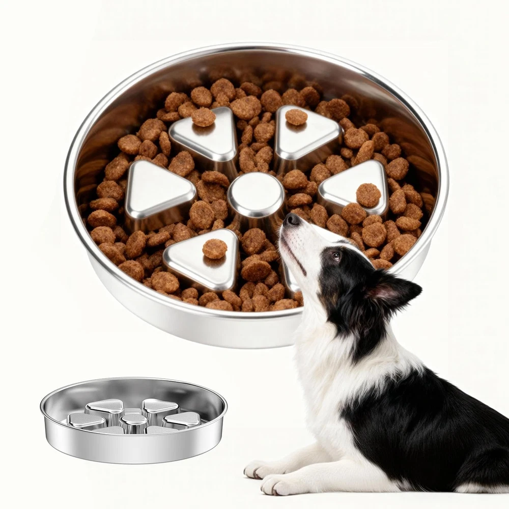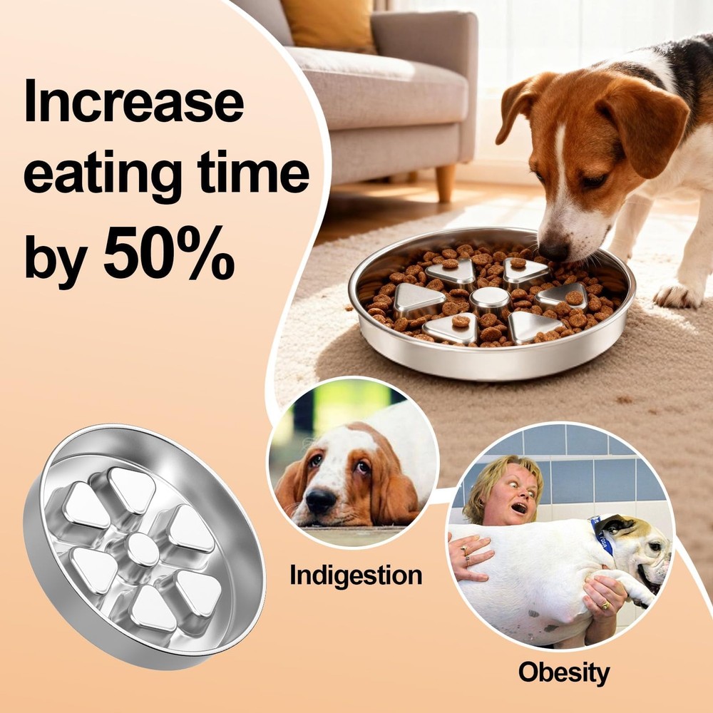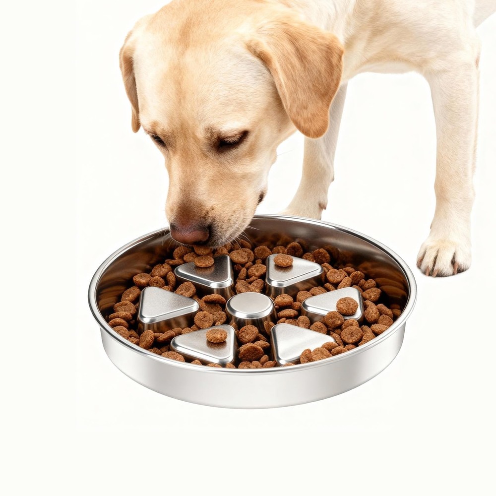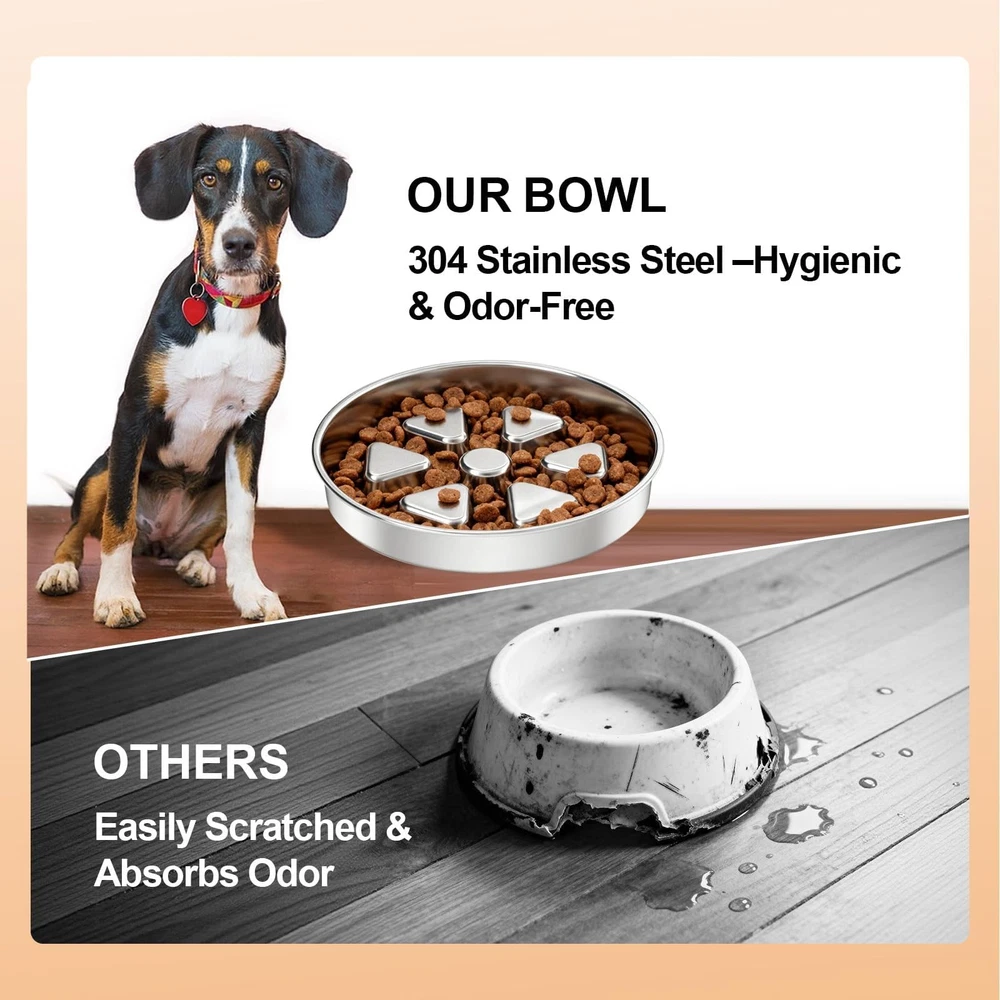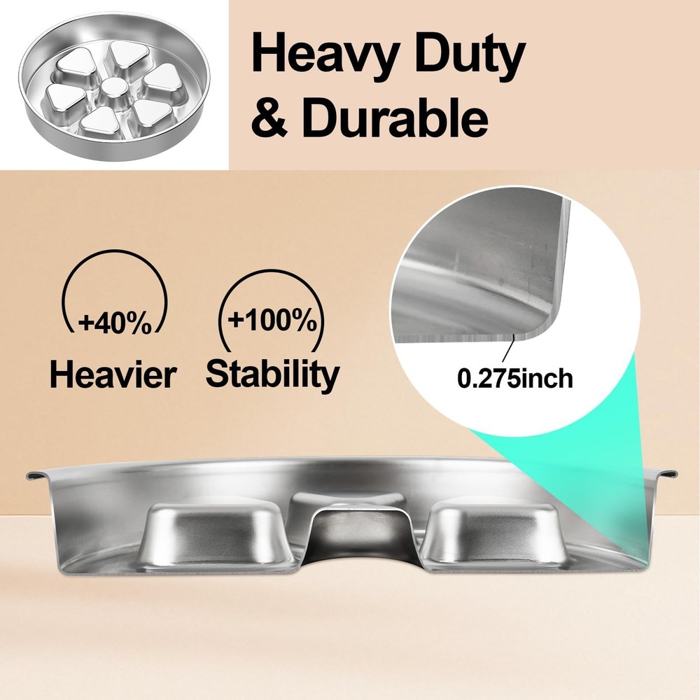 Our 2-in-1 Stainless Steel Slow Feeder Bowl is designed to encourage slower, more engaging meals. It features a double-sided design with 2.5cm high ridges to help moderate eating pace. Constructed from 7mm thick 304 stainless steel, it provides enhanced durability and stability compared to many standard bowls. The securely fused non-slip base minimizes sliding and spills. Offering two functions in one, it works as a slow-feeding maze on one side and a regular dish on the other. For easy maintenance, it is dishwasher safe. SLOW FEEDER FOR BETTER DIGESTION - This slow feeder dog bowl features 0.98inch (2.5cm) high ridges that help your dog eat slowly, encouraging thorough chewing. This natural pacing aids in reducing gulping and promotes healthier digestion. HEAVY-DUTY 304 STAINLESS STEEL BOWL - Built with solid 7mm thick 304 stainless steel for exceptional durability. This premium metal slow feeder is rust-proof, chew-resistant, and resists odors and stains far better than plastic dog bowls. SECURE NON-SLIP BASE - The stainless steel base features a permanently fused silicone ring. It grips any floor firmly, ensuring this slow feeder stays anchored with zero sliding, tipping, or chasing during meals. IDEAL CAPACITY & EASY TO CLEAN - This stainless steel bowl holds up to 3 cups, ideal for medium to large dogs. It works for dry kibble, wet food, or water, and its seamless metal surface is 100% dishwasher-safe for effortless cleanup. DUAL-SIDED FOR LONGEVITY & CONVENIENCE - This heavy-duty stainless steel dog bowl is built with two usable surfaces for long-lasting performance. The primary side features effective slow-feeding ridges, while the reverse textured side serves as a handy backup bowl for snacks.