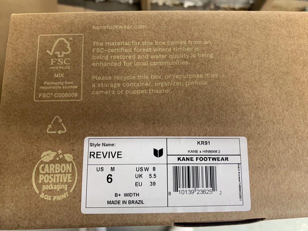 Brand new with box Men's size 6, Women's size 8 All sales are final, no returns Fast shipping! KANE Revive shoes are made of bio-based closed-cell RestoreFoam™. The shoes don’t absorb moisture, so they’re just as functional in water as they are on land, and they’re quick-drying. The KANE Revive shoes can easily be wiped or washed off with soap and water. Please avoid exposure to extreme heat or sun for this can cause the shoes to shrink or warp. Dishwashers, washing machines, or hot cars can also cause the shoes to shrink or warp. The KANE Revive sizing follows the standard sizing for a running shoe. Therefore, the size guide should be utilized according to your typical running shoe size. IN BETWEEN SIZES? We recommend sizing down (ex. if you typically wear size 10.5 - select size 10). For a wider foot, go one half size up (ex. if you typically wear size 10.5 - select size 11).