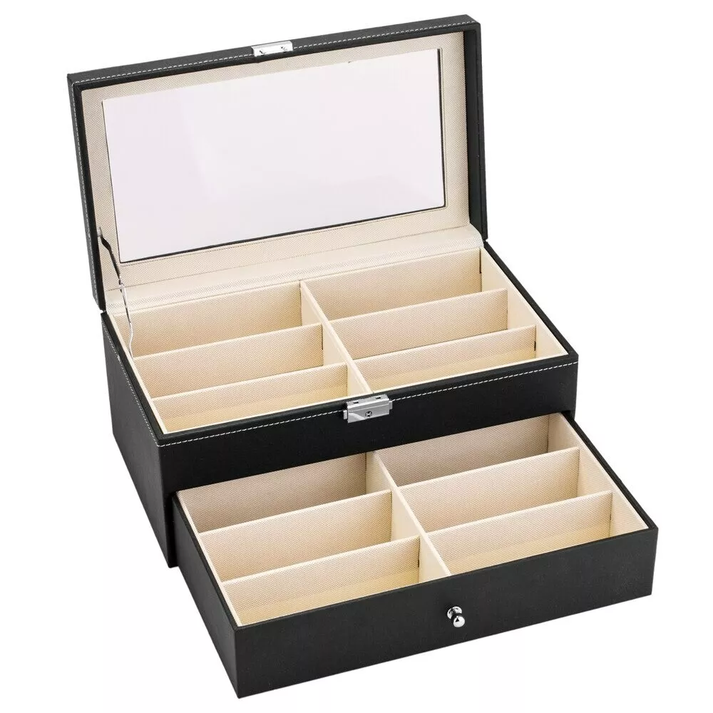 Introductions: Glasses Display Box is great for personal use, shop display and home decoration. What a great way to not only display your jewelry but also save time in the morning. Real glass top provides you with better view to choose your beloved jewelry. The lid has a metal hinge attached to keep it from falling back. Metal lock with keys makes sure of safety. This is a nice showcase and works well to keep your glasses safe and organized. Nice gift idea for girls, boys, women and men. Features: 1. High quality PU leather glasses and jewelry box with attractive appearance,simple structure,fine workmanship and sturdy construction 2. It's divided into plenty of unit space which are easy to clean and maintain,It will keep your Eyeglasses and sunglasses securely 3. This elegant glasses case allows you to show your glasses and other jewelry while protecting them away from dust,fingerprints,scratches and thieves 4. Clear glass top gives you a open view and you can find your favorite treasure in seconds with this unique glasses and jewelry box. Perfect for home and business use,and a wonderful gift idea Specifications: 1. Material: High Grade PU Leather,Medium Density Fiberboard 2. Window: Glass 3. Color: Black 4. Product Dimensions (L x W x H): 13.4"" x 7.6"" x 6"" (34 x 19 x 15 cm) First Tier: Slot Size (L x W x H): 6.2"" x 2.3"" x 1.6"" (15.7 x 5.8 x 4.1 cm) Second Tier: Slot Size (L x W x H): 6.2"" x 2.3"" x 1.6"" (15.7 x 5.8 x 4.1 cm) Packaging Includes: 1 x Glasses Display Box