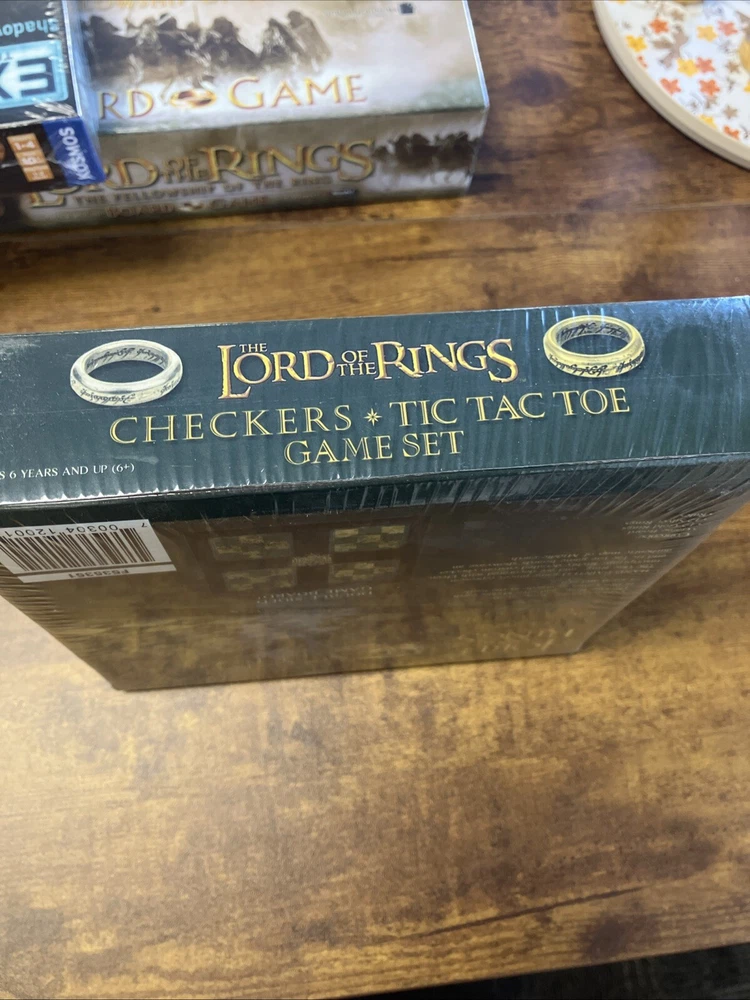 The product is a new Lord of the Rings Checkers/Tic Tac Toe board game set that is sealed in its original packaging. It is a game board featuring characters from the Lord of the Rings franchise, intended for players aged 6 years and up. The game can be played as traditional checkers or tic-tac-toe, providing entertainment for individuals in the age ranges of 12-16 years, 8-11 years, and 17 years & up who are fans of the Lord of the Rings series. Created by USAopoly, this board game offers a themed gameplay experience centered around the world of war in the Lord of the Rings universe.