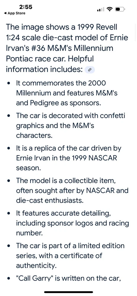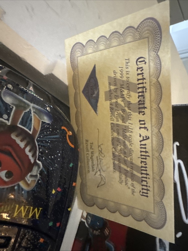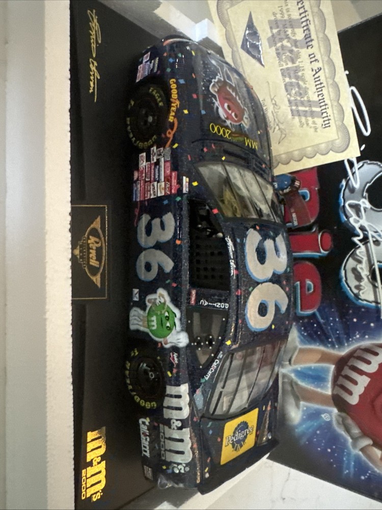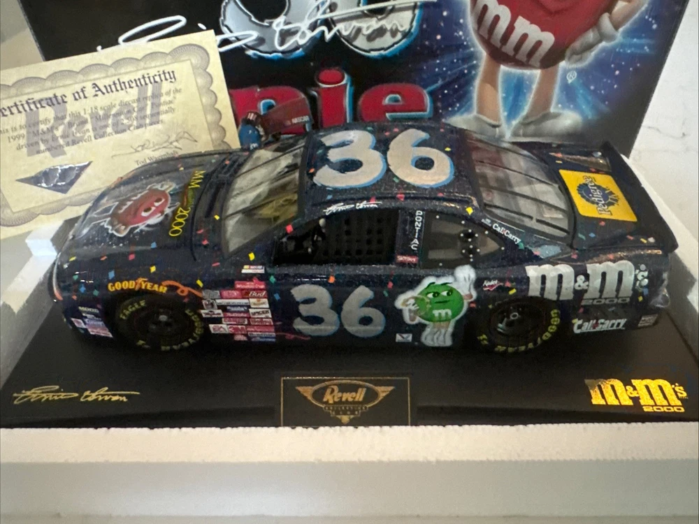 Ernie Irvan's #36 M&M's Millennium Pontiac race car • It commemorates the 2000 Millennium and features M&M's and Pedigree as sponsors. • The car is decorated with confetti graphics and the M&M's characters. • It is a replica of the car driven by Ernie Irvan in the 1999 NASCAR season. • The model is a collectible item, often sought after by NASCAR and die-cast enthusiasts. • It features accurate detailing, including sponsor logos and racing number. • The car is part of a limited edition and is a collectible.