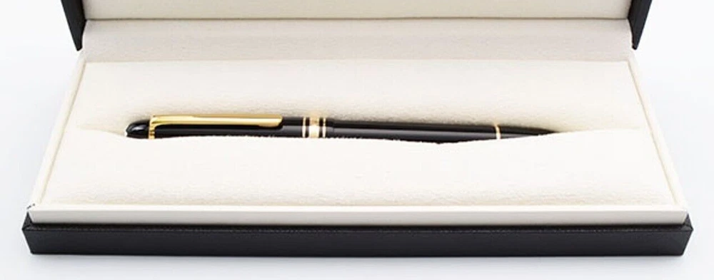 Montblanc PenIntroducing the Montblanc Meisterstuck 145 Fountain Pen, crafted with precision and elegance. This fountain pen features a medium (M) 14k gold nib and black ink, perfect for any writing occasion. The pen is made of resin and gold, with gold trim and a vintage design that adds charm and sophistication. Ideal for collectors and writing enthusiasts, this Montblanc fountain pen is a classic addition to any collection. Whether for personal use or as a gift, this timeless writing instrument is sure to impress. The black box indicates slight shelf wear. As good as new.