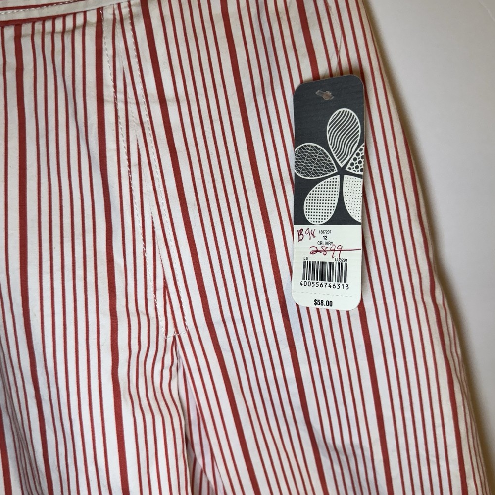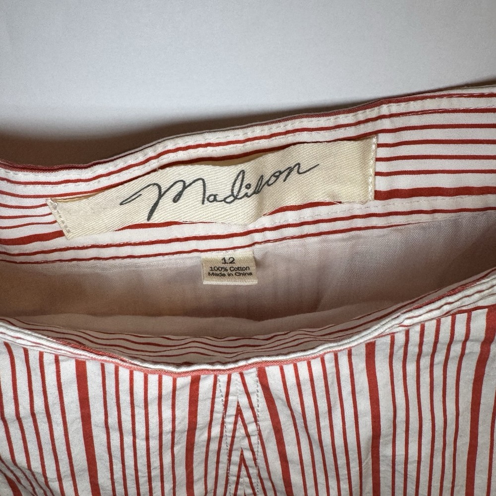 This new woman's size 12 A-line swing flare midi skirt by Madison features a red and white striped pattern, perfect for various occasions like travel, weddings, parties, or everyday wear. Made from cotton material, it has a mid-rise waist with a zip closure for easy wear. The skirt is accented with a zipper and is lined for added comfort and style. The classic, preppy design with a modern twist makes it a versatile piece for the winter, summer, fall, or spring seasons. Perfect for those who appreciate designer, logo, or classic themes in their wardrobe.