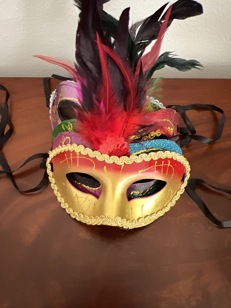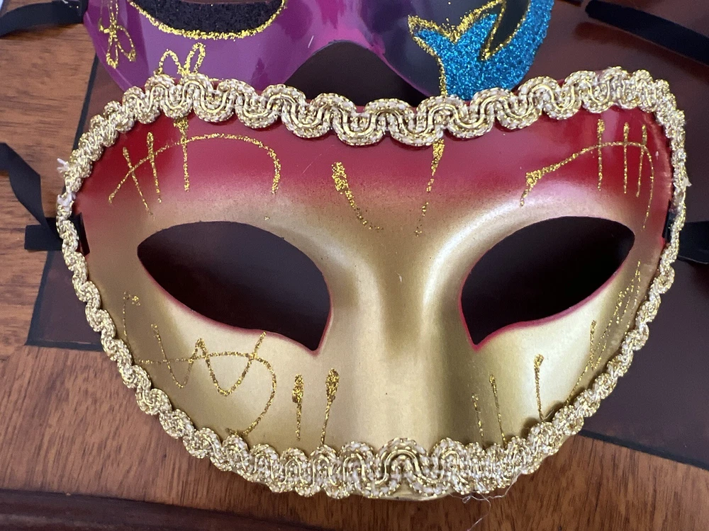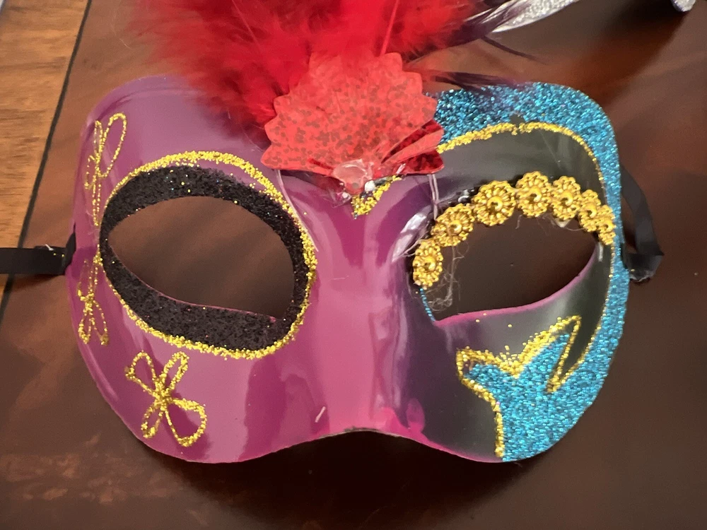 Get ready for your next masquerade event with this lot of 5 new Masquerade masks! These stunning gold and silver masks are perfect for Mardi Gras, Halloween, or any costume party. The masks have a one size fits all design and are suitable for both men and women. Each mask features intricate details and a unique design that will make you stand out from the crowd. These masks are perfect for those who want to add a touch of mystery to their costume without revealing too much. Don't miss out on this opportunity to own a set of stunning Masquerade masks!