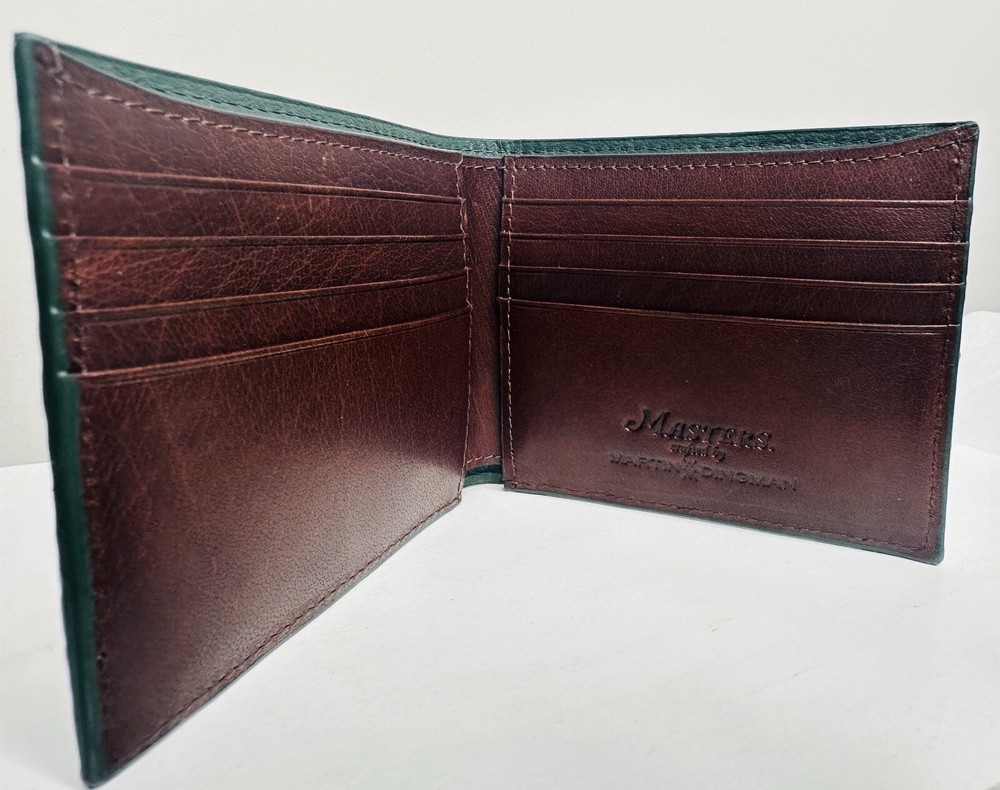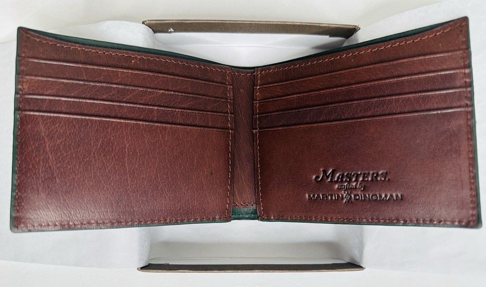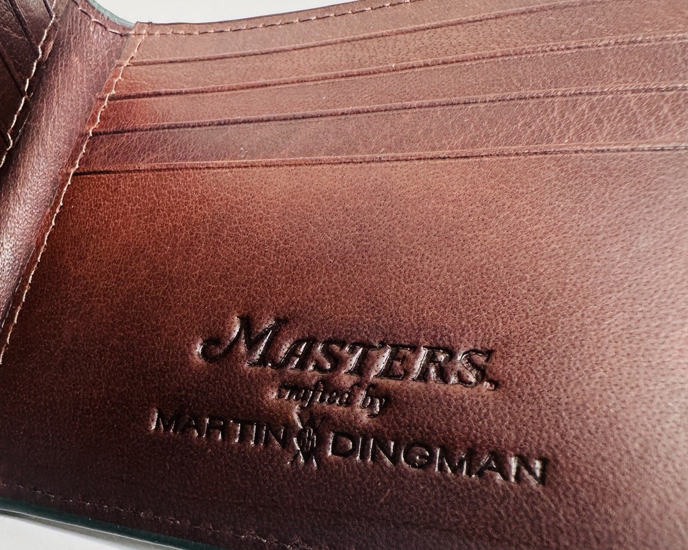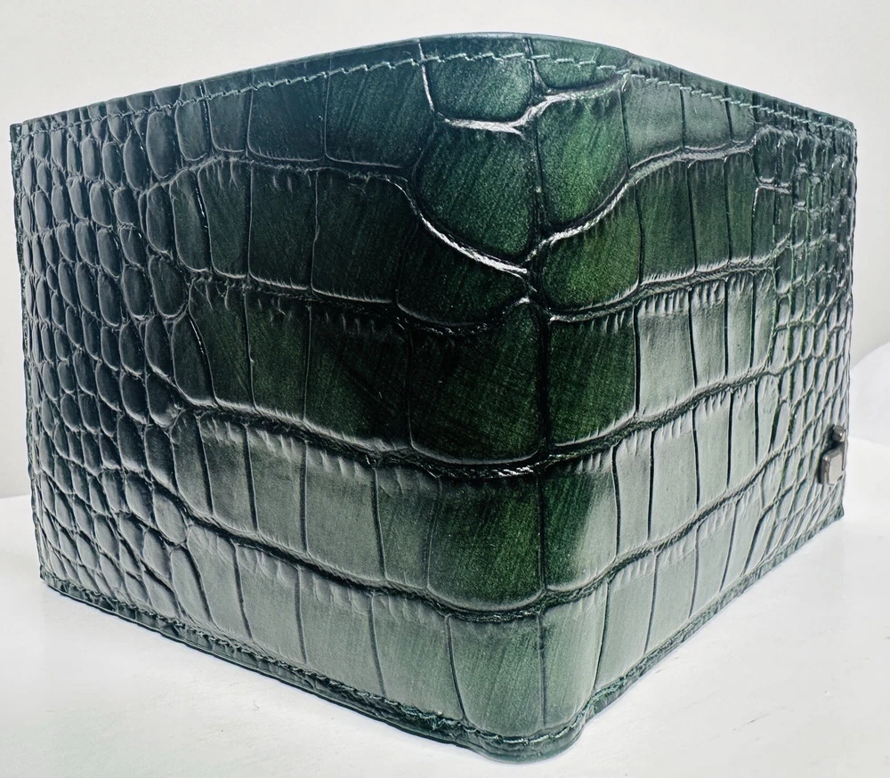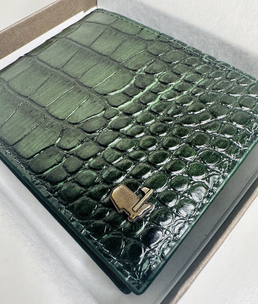 This Martin Dingman Design Masters 2024 Wallet Collection is a must-have for any stylish man. The wallet features a unique green alligator grain material and a sleek bifold design. It also includes several card holders and a folding feature for added convenience. The wallet is adorned with the Martin Dingman logo for a touch of sophistication. The wallet is perfect for any occasion and is a great addition to any outfit. Its metal theme and durable material make it a reliable choice for everyday use. Whether you're going out for a night on the town or just running errands, this wallet has got you covered.