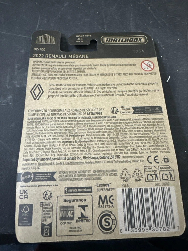 The product is a brand new Matchbox diecast model of a 2022 Renault Megane in black color. It is part of the 2022 collection, featuring a detailed design and comes in its unopened box. Made for boys and girls, this toy vehicle is part of the Cars character family and is manufactured in Thailand. This collectible item is a contemporary manufacture that appeals to toy and diecast vehicle enthusiasts.