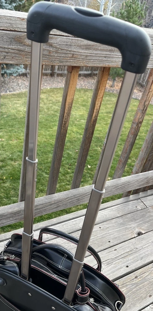 New! McKlein Glen Ellyn 94365 Black Leather Detachable Wheeled Women's Briefcase Case Bag Removable wheeled sleeve Top handles Telescopic handle Measures approx: 15"HX17"WX7"D New with tags - missing detachable shoulder strap