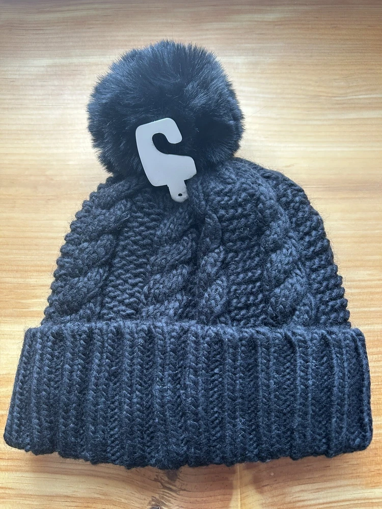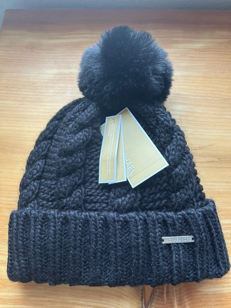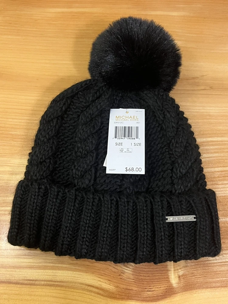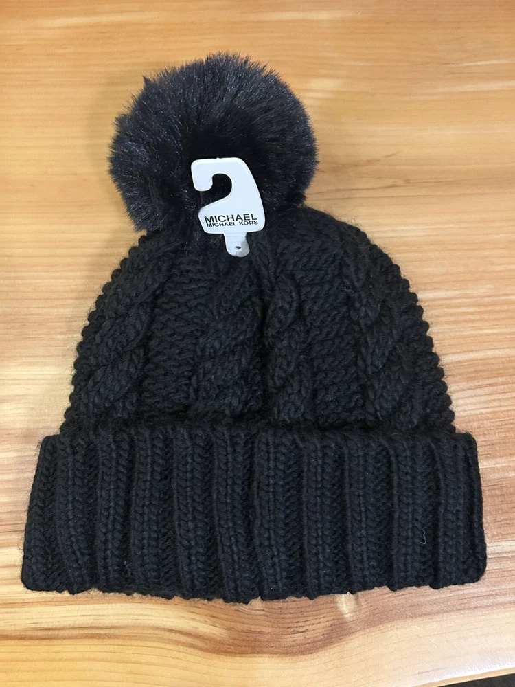 MK tags pictured come with the item, they are no longer attached. Elevate your winter look with this Michael Kors Cable Knit Pom Beanie Hat in Black. The classic and designer theme of this beanie with the iconic Michael Kors logo accent makes it a must-have for any woman's casual or activewear collection. Made of stretchy polyester knit fabric, this beanie is perfect for any one size fits all occasion. This beanie is stylish and functional, providing warmth and comfort during the chilly seasons. The solid pattern and cable character of the knit make it a versatile accessory that can be paired with any outfit. Whether you're traveling, working out, or just running errands, this beanie is the perfect addition to your wardrobe! Thank you!