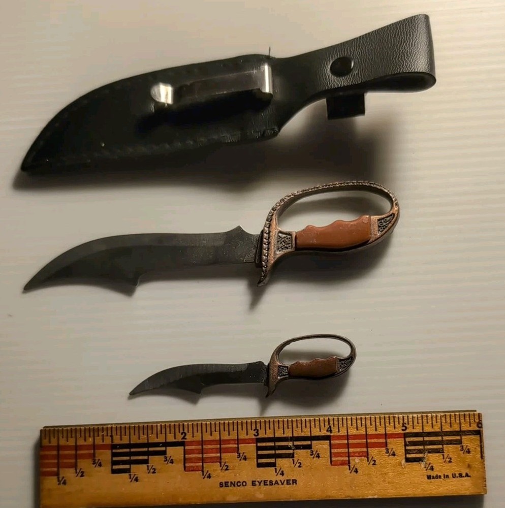 This Mini Double Knife Set features fixed blades made of stainless steel with a full tang and silver color. The set includes two mini pirate swords with blade lengths between 2-3 inches, featuring a plain edge and a plastic handle. Ideal for everyday carry, throwing, boot, or survival use, these knives come with a leather sheath for convenient storage and transport. Perfect for collectors or enthusiasts looking for unique and versatile blade options. See scans to help see the condition.