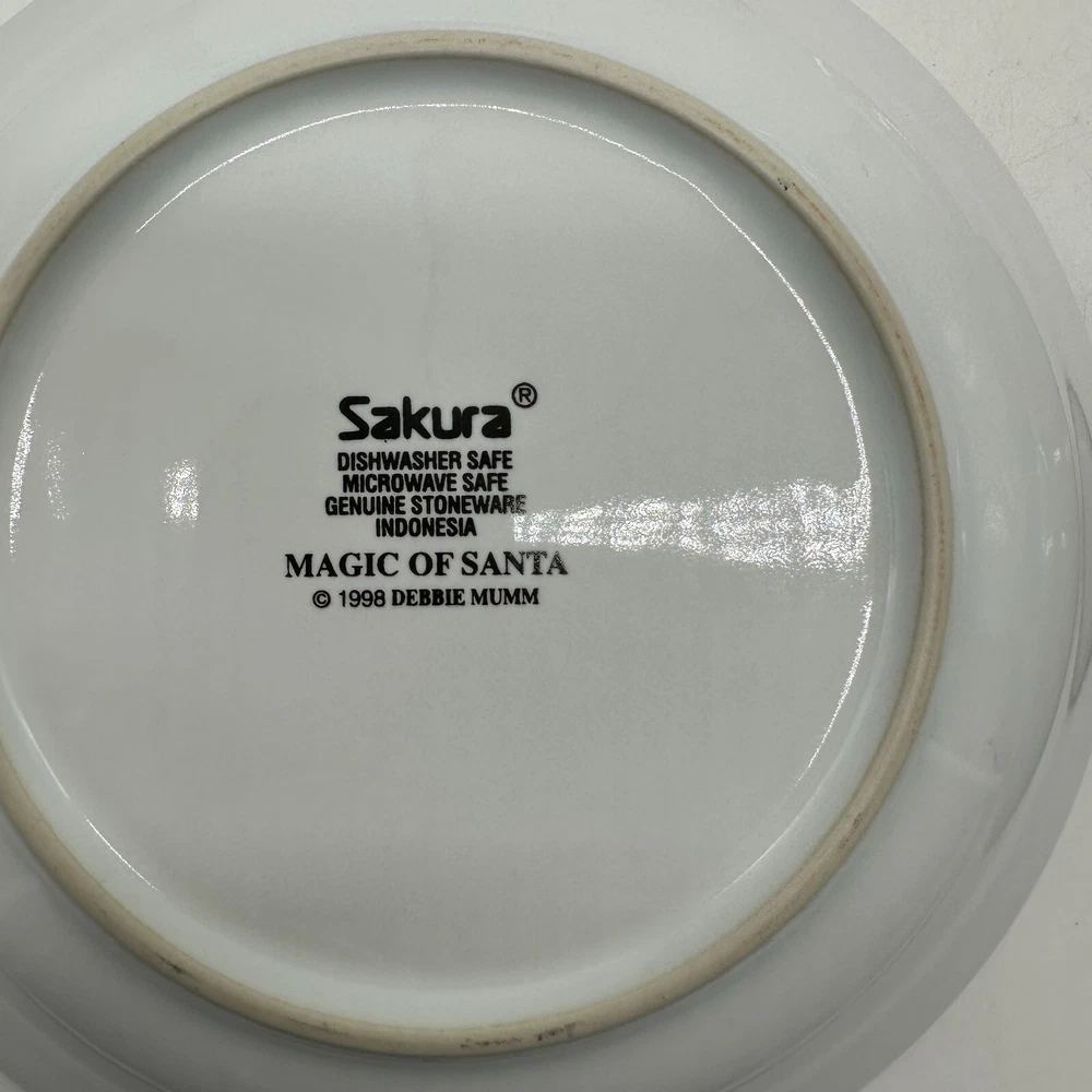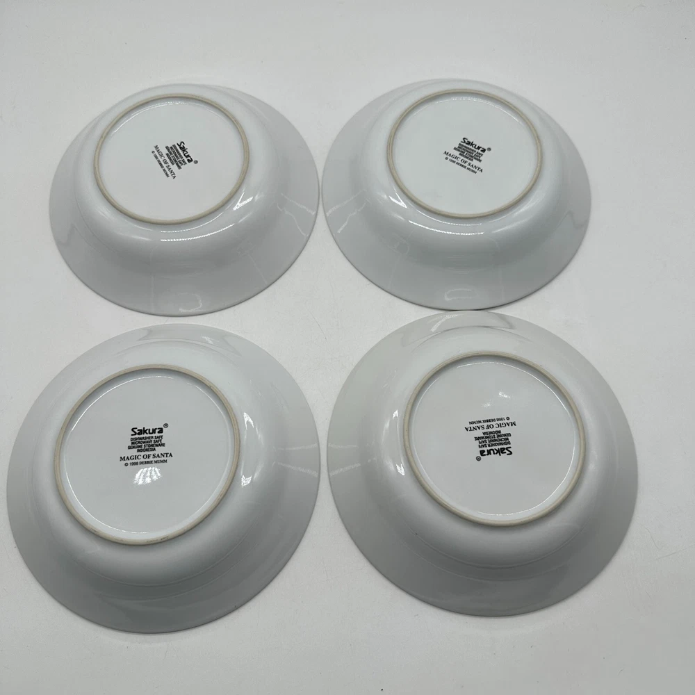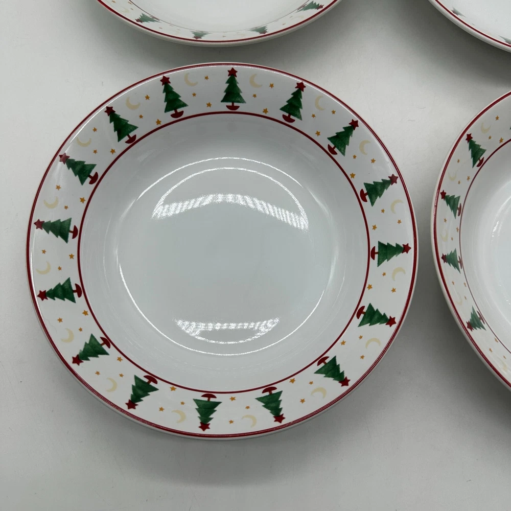 This is a set of four vintage Debbie Mumm cereal soup bowls from the "Magic Of Santa" collection by Sakura. The bowls feature a Christmas tree pattern in red and green colors on a round stoneware material. The design is original and printed on with a glossy finish, making them perfect for the Christmas occasion. Each bowl measures 7 5/8 inches in diameter.
